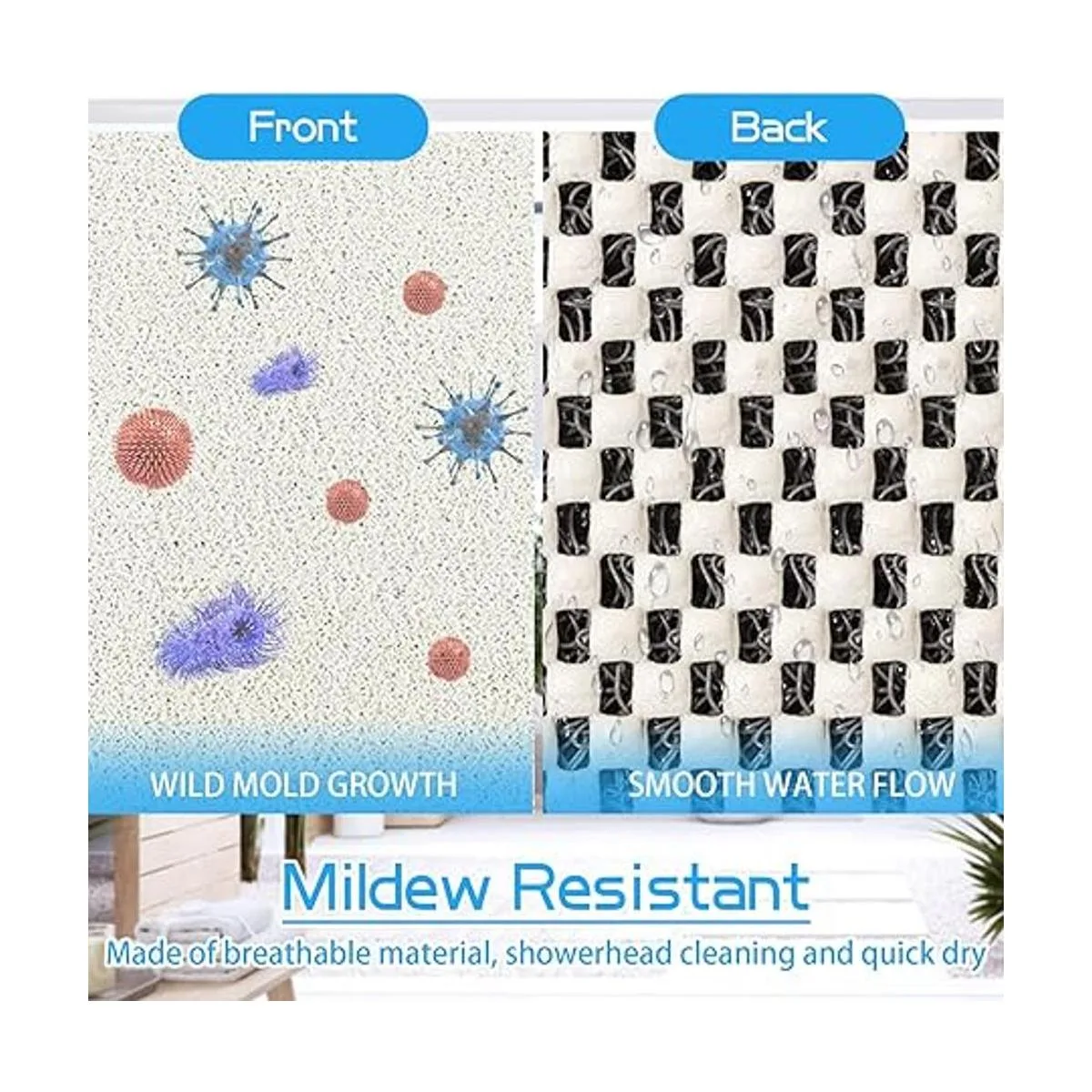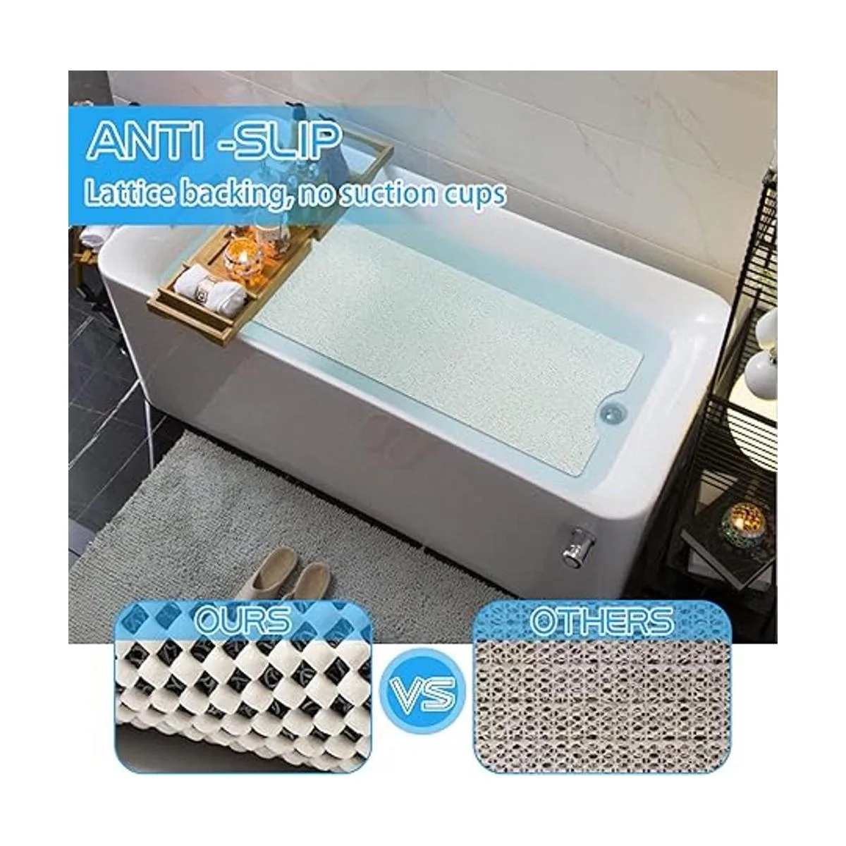Antideslizante y seguro de usar: en lugar de la alfombrilla de bañera tradicional que se desliza alrededor y dañará la superficie de tu bañera o suelo después de usar aceite de baño o gel de ducha, nuestra alfombrilla de baño tiene respaldos a cuadros más duraderos y superficie rugosa, por lo que se agarrará al suelo de forma constante cuando el respaldo de goma se moje. La alfombrilla de bañera antideslizante no contiene tazas, lo que es una medida de seguridad esencial para familias con niños pequeños o ancianos.