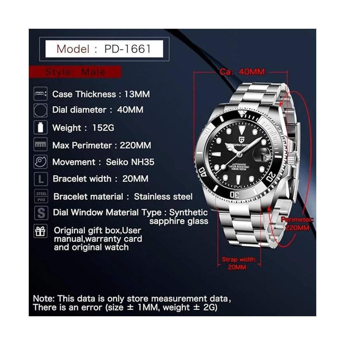 Relojes para hombre de buena calidad: Pagani Design 1661 es un reloj automático mecánico de lujo. Utiliza el mecanismo Seiko NH35A que da la hora precisa