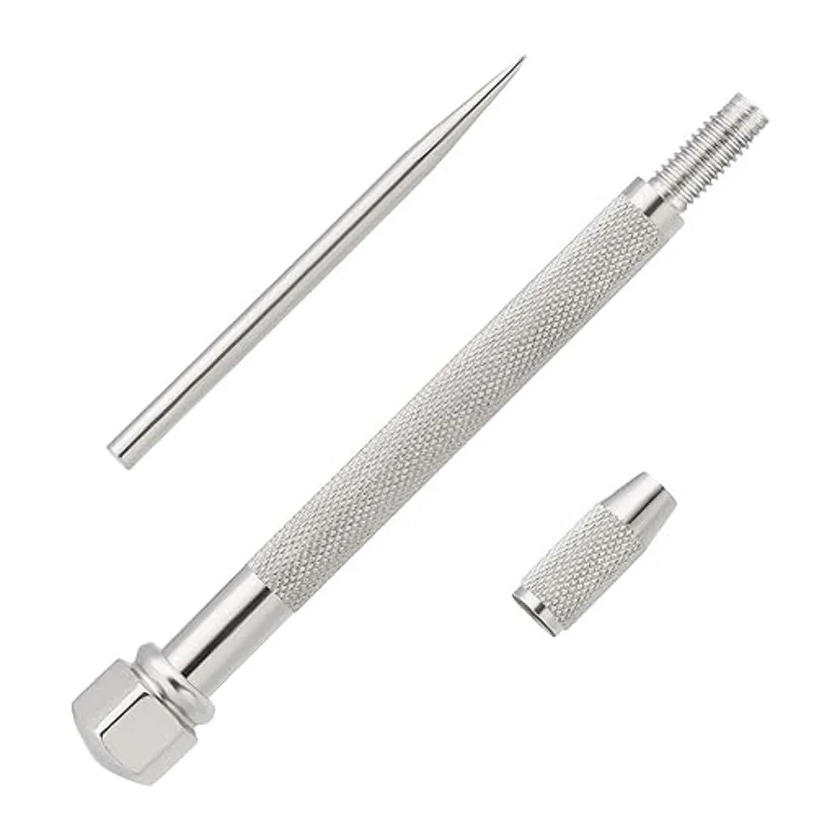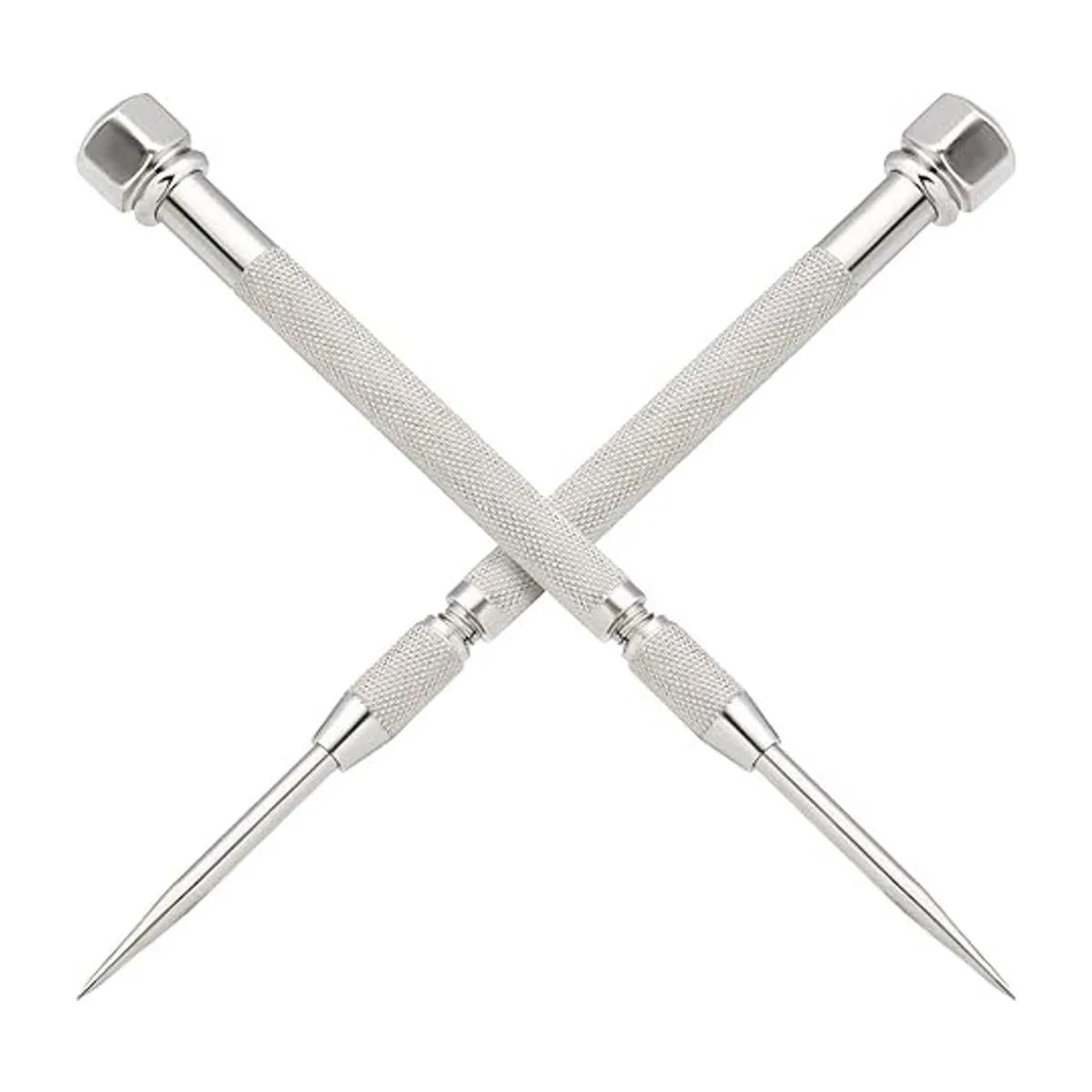 Característica: la aguja del tratamiento térmico del escribidor es de 5055 grados. El garabato se mantiene firmemente en el mango por un portabrocas moleteado y cuando no está en uso se puede invertir, telescópico en el mango y bloqueado por el portabrocas. La cabeza en forma de hexágono evita que se mueva.