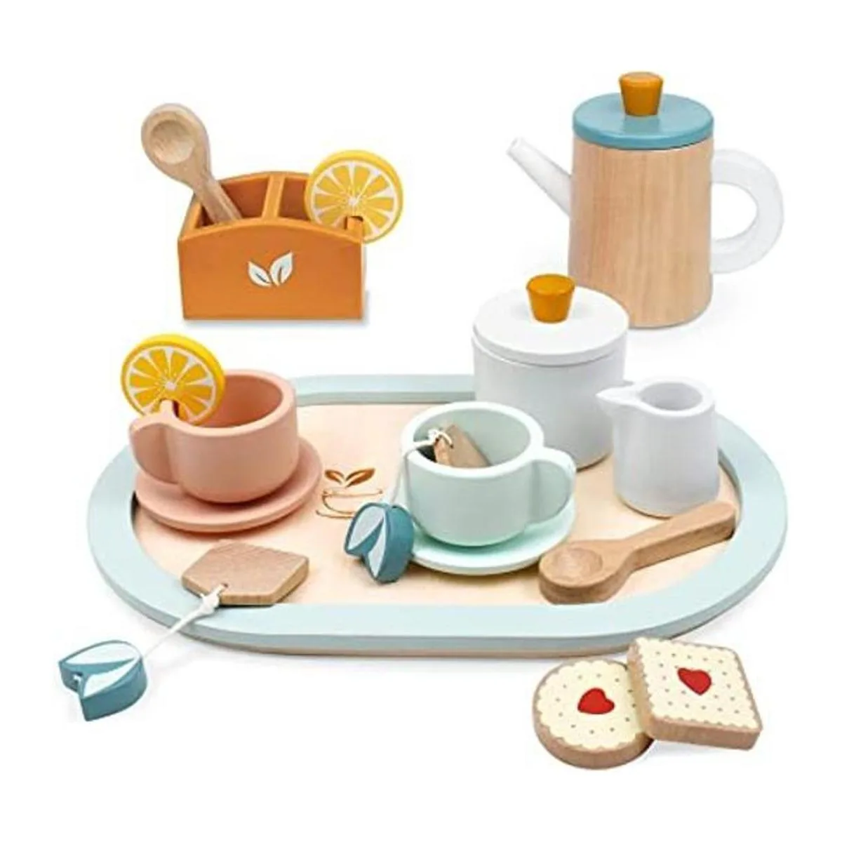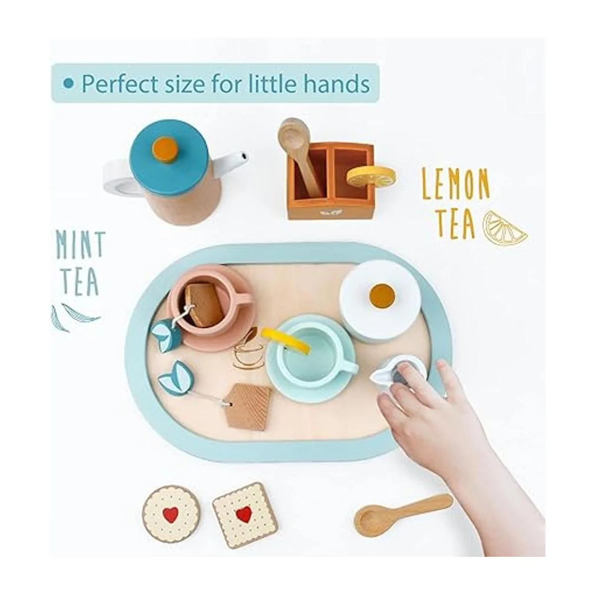 Juegos de alimentos de calidad: accesorios de juego de 17 piezas en total El juego de té de madera PairPear viene completo con todo lo que necesitas para una pequeña fiesta de té. Incluye una bonita bandeja 10.2 x 6.9 pulgadas, una tetera con tapa extraíble, 2 tazas, 2 platillos, 2 cucharas, jarra de leche, azucarera con tapa, 2 galletas, 2 bolsas de té de madera, 2 rebanadas de limón y una pequeña caja.