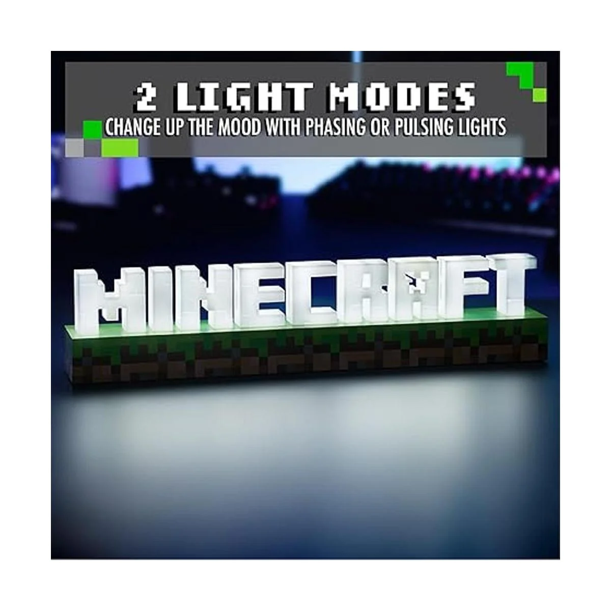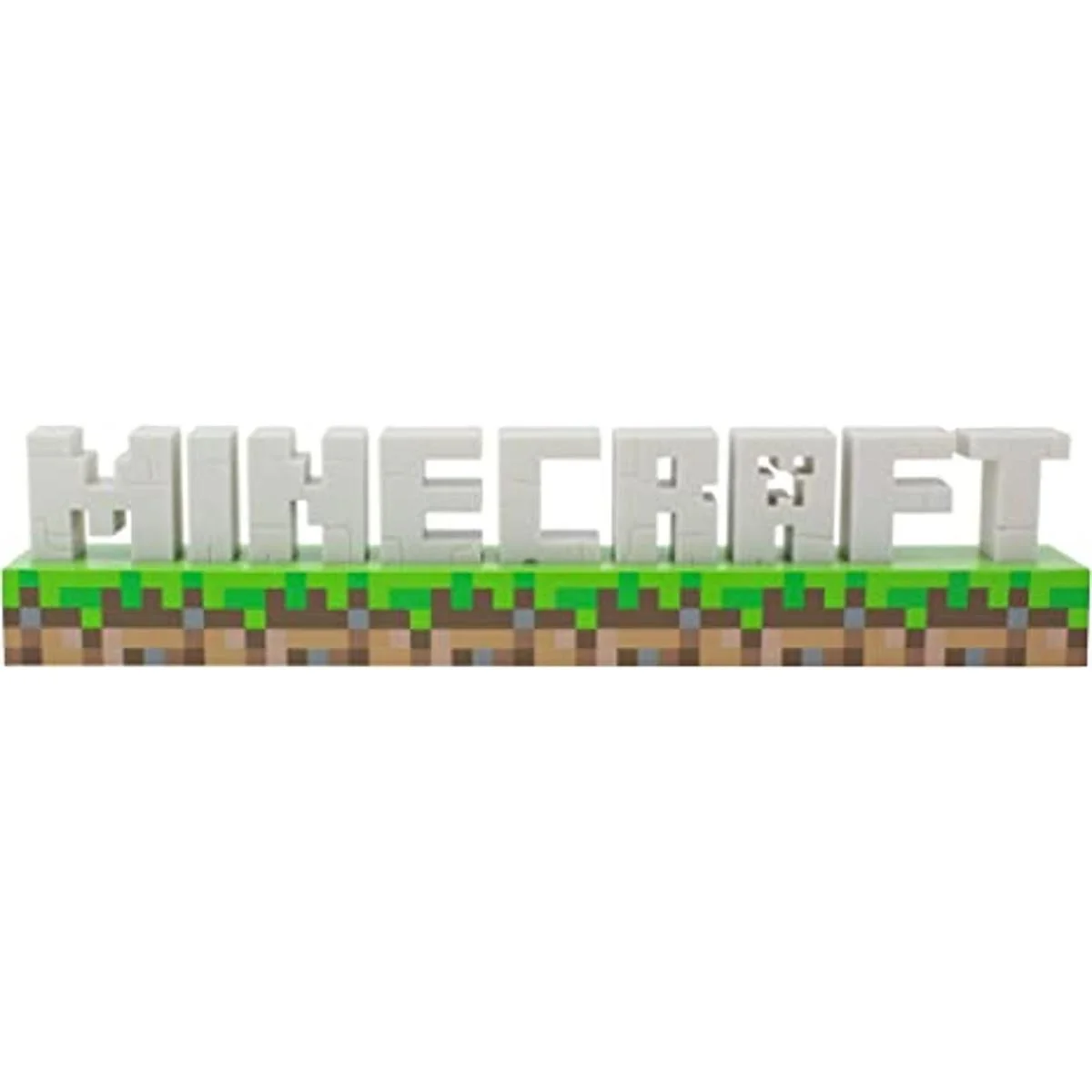 Logotipo icónico: diseñado para parecer que salió directamente de Minecraft, las letras del logotipo de píxeles blancos deletrean Minecraft y se mantienen en la parte superior de los bloques de tierra. Esta luz funciona con el cable USB incluido o 3 pilas AAA no incluidas.