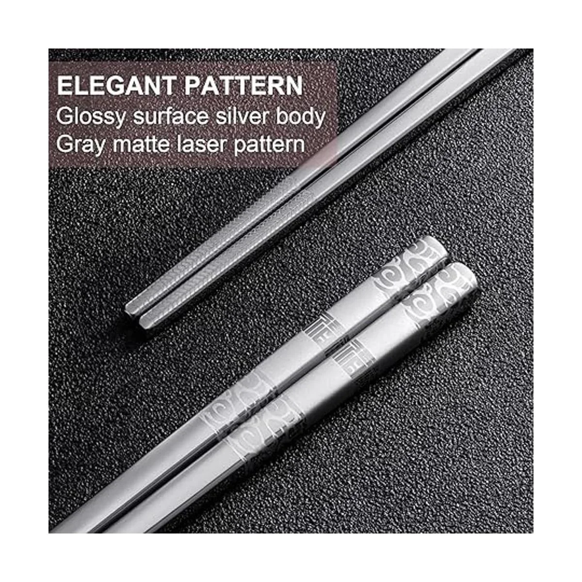 Patrón elegante: los palillos de metal tienen un bonito patrón láser. Superficie brillante, cuerpo plateado, patrón láser gris mate. No se decolora después de un uso prolongado.