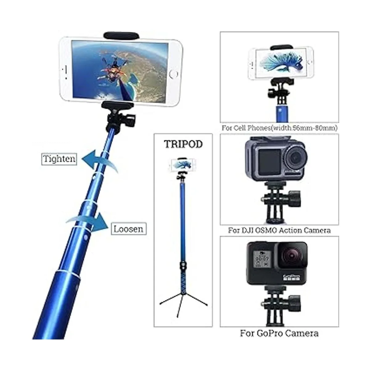 Calidad superior: viene de barra de aluminio de aviación de alta calidad y mango de goma antideslizante antioxidante, que satisface todos los requisitos del palo selfie. Se adapta a cámaras GoPro Hero 8/7/6/5/4/3/3/2/1/Session / para cámaras Ricoh Theta S, M15 / cámaras compactas rosca de 1/4 / teléfonos celulares 2.205 in3.150 in