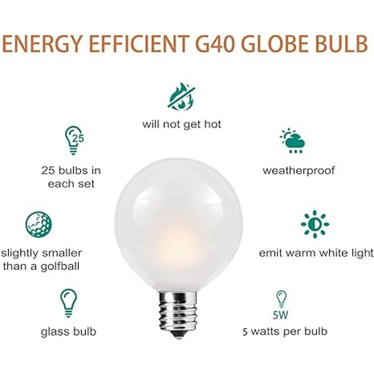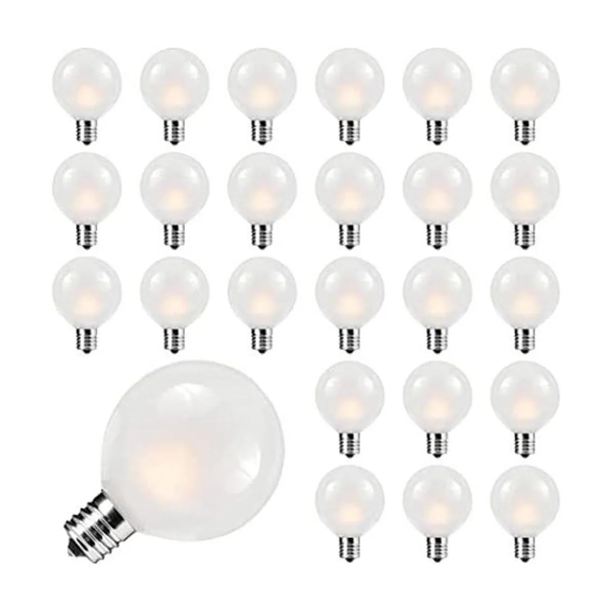 Juego de 25 bombillas de repuesto esmeriladas G40, compatibles con la mayoría de luces de cadena. Nuestras bombillas de globo blanco esmerilado son adecuadas para base de candelabro C7/E12.