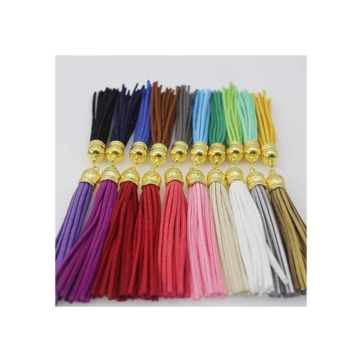 PAMIR TONG Juego de 100 borlas de piel de gamuza sintética para decoraciones, llaveros, pendientes, correas de teléfono celular, accesorios de joyería, manualidades oro, llavero