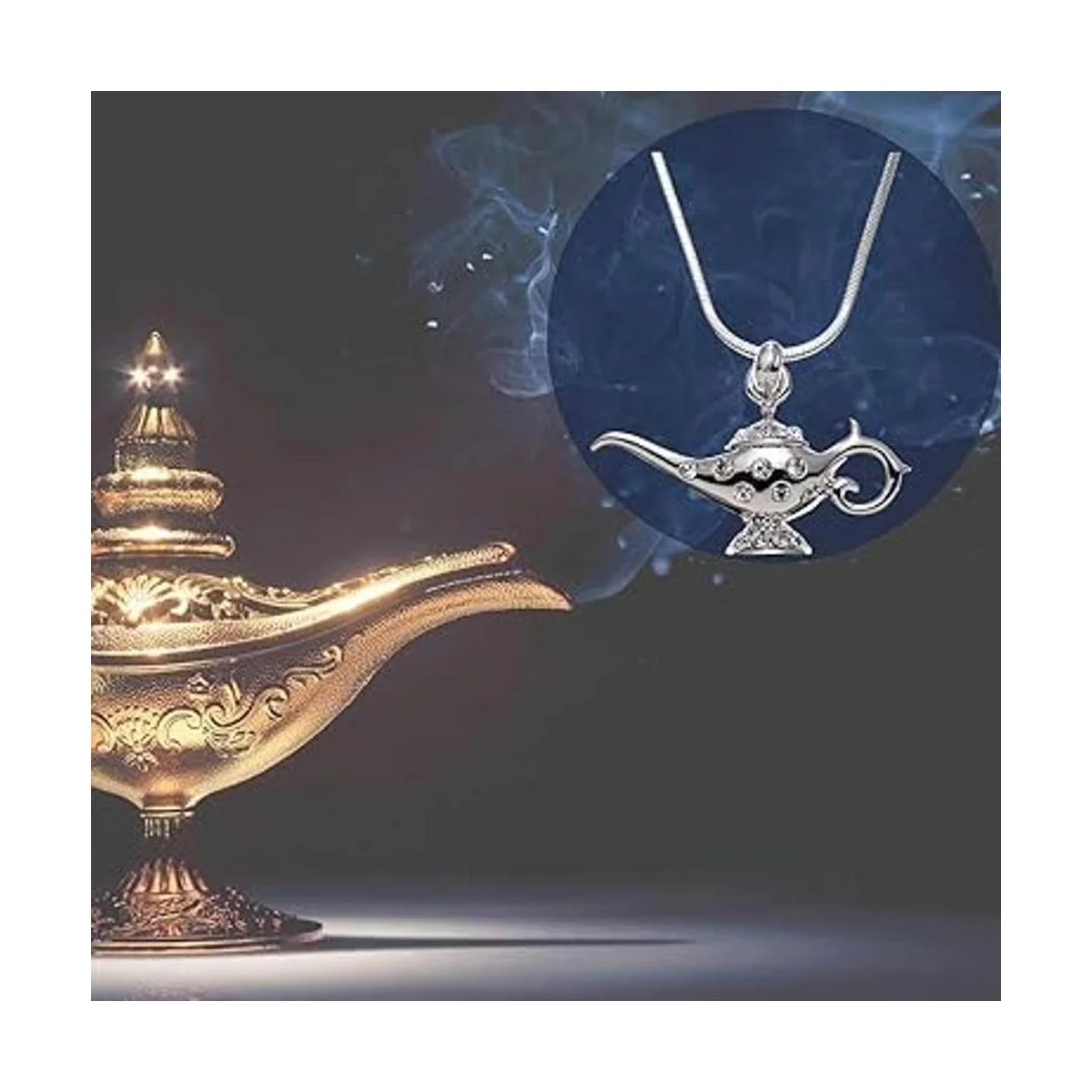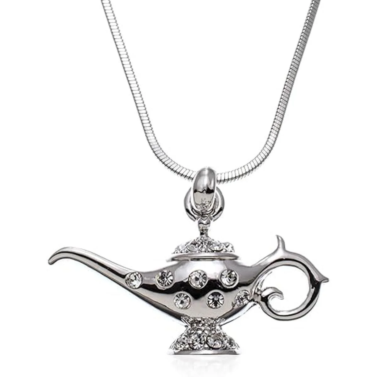Aquí hay un divertido collar de plata y cristal claro tachonado de la lámpara viejo colgante. Este adorable colgante mide aproximadamente 1 1/4 de ancho y 3/4 de largo. Viene en una cadena de serpiente plateada de 18.0 in.