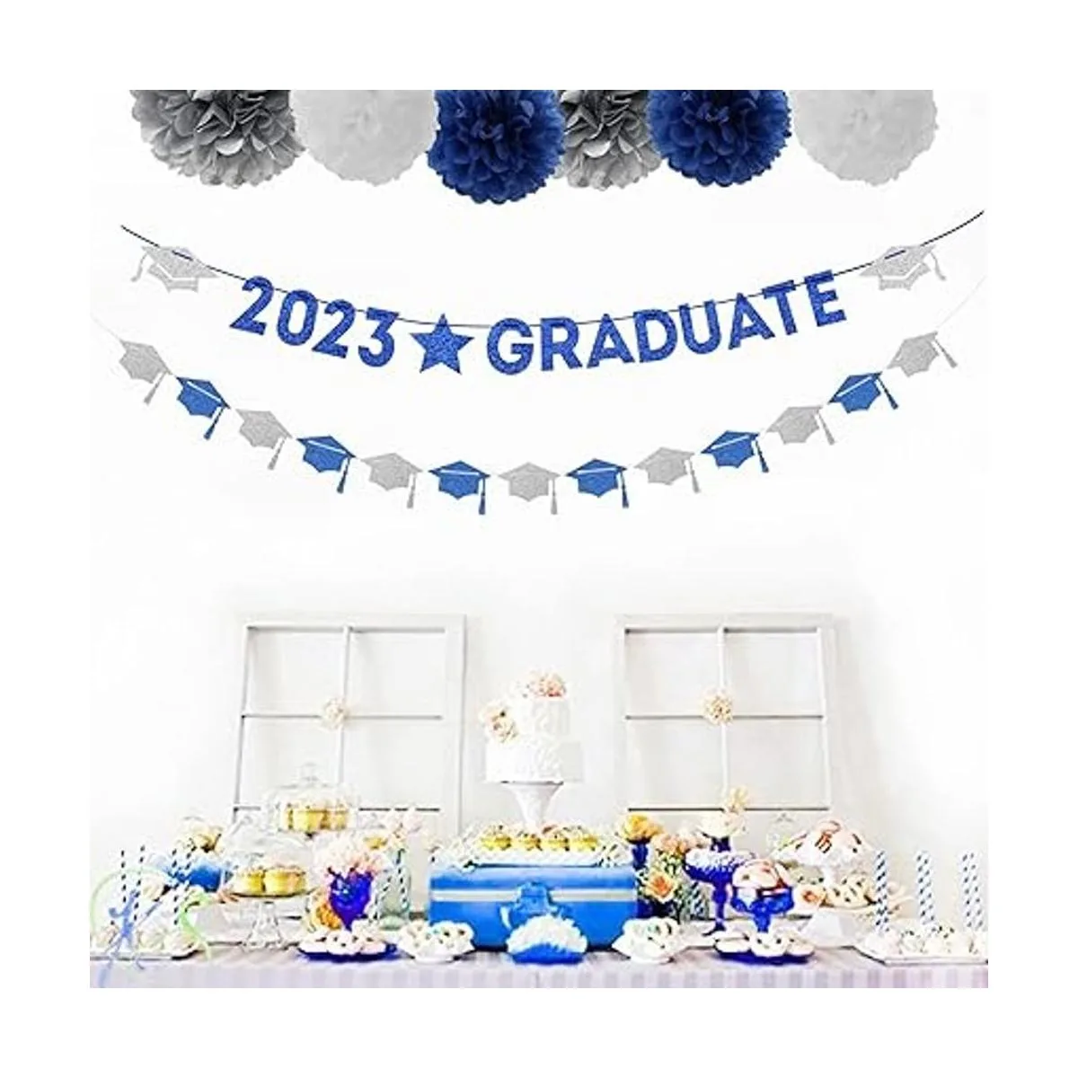Pancarta de graduación para decoración de fiesta azul marino, blanco y plateado, 8 piezas, kits de serpentinas de guirnalda, pompones de papel de seda, pancarta de graduación 2022, felicitación de graduación, sorpresa duradera