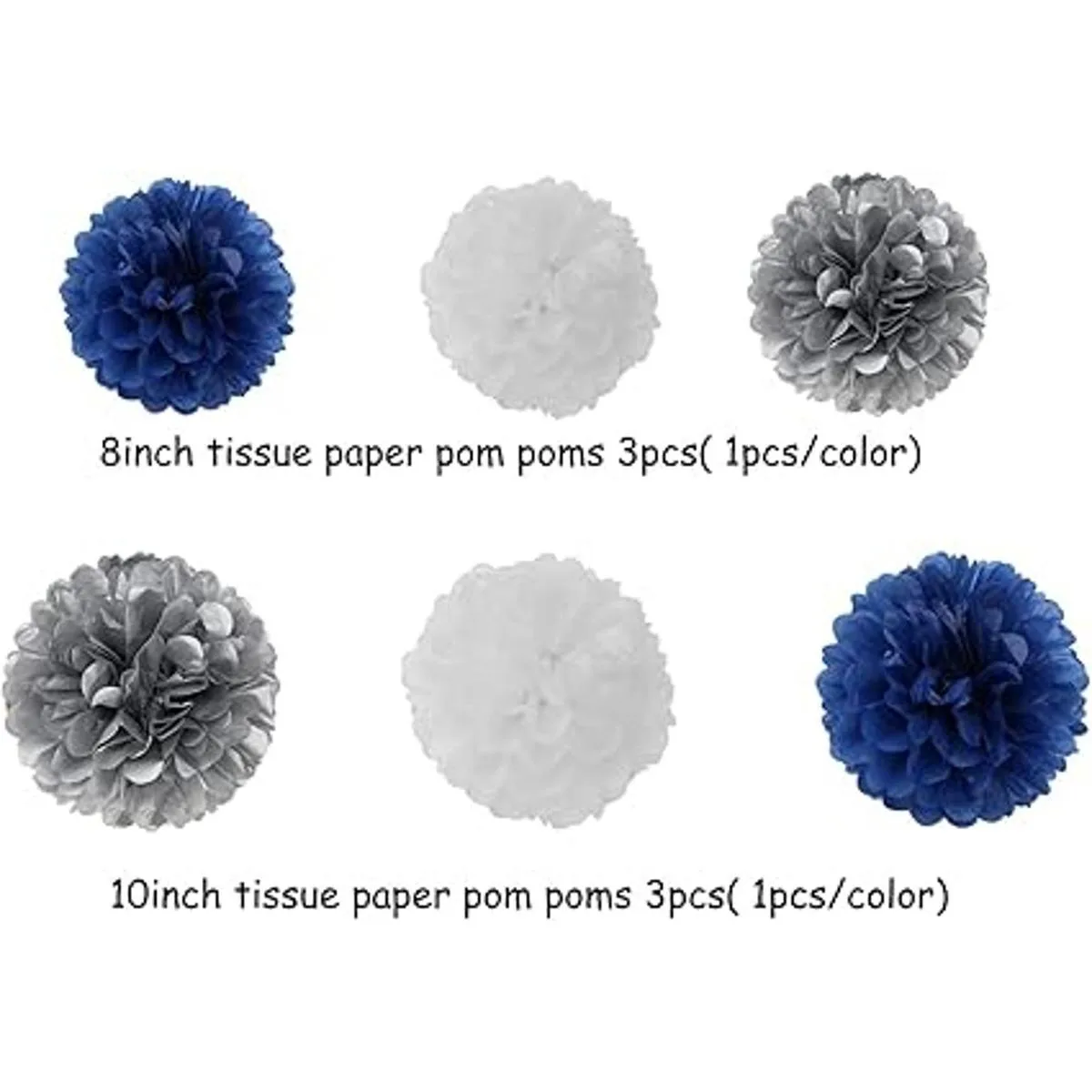 Kits de fiesta de color azul marino y blanco y plateado: los kits de decoración de fiesta incluyen 6 flores de papel de seda: 3 piezas de 8 pulgadas y 3 piezas de 10 pulgadas en azul marino y blanco, 1 guirnalda de serpentinas de guirnalda, 1 pancarta de graduado 2022. Total de 8 unidades.