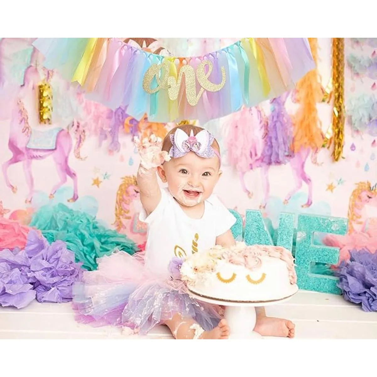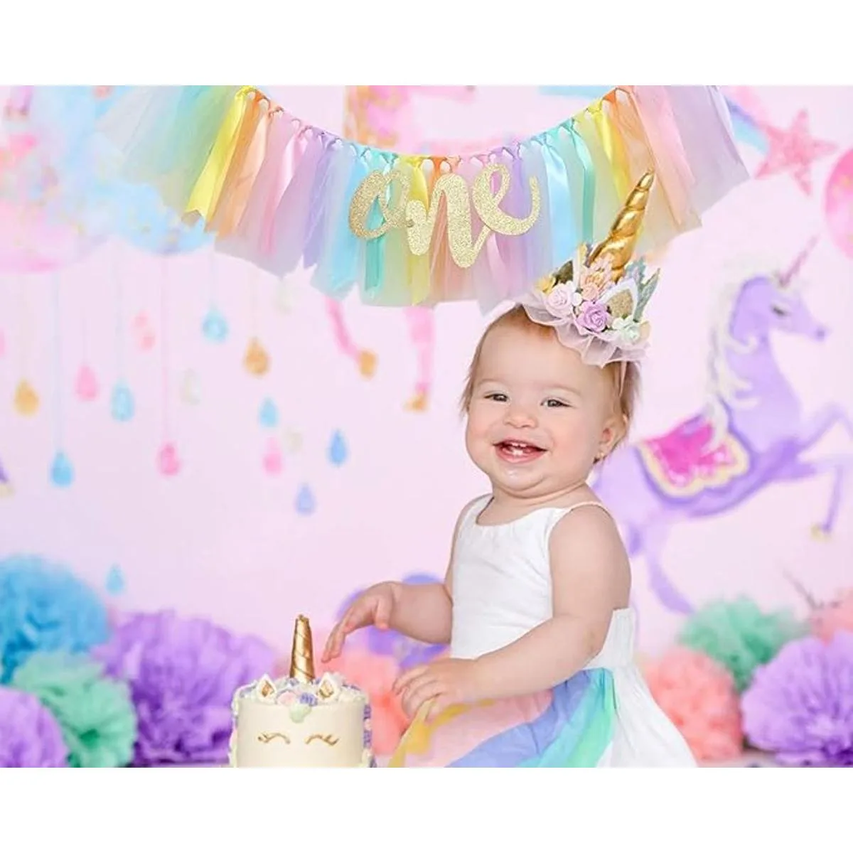 Decoración perfecta para el primer cumpleaños: nuestra falda para silla alta está diseñada con una pancarta uno y decoración para tartas de pegaso. Este tutú único de pie alto se viste para tu fiesta y hará que el cumpleaños de tu niña sea increíble, mostrando delicia y elegancia.