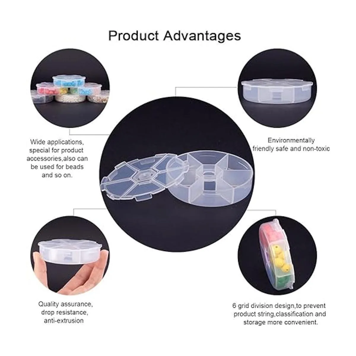Hecho de plástico, el recipiente siempre tiene muchas rejillas interseptales en el interior. En este caso, tus cuentas de joyería se pueden poner en el recipiente ordenadamente por tipo.