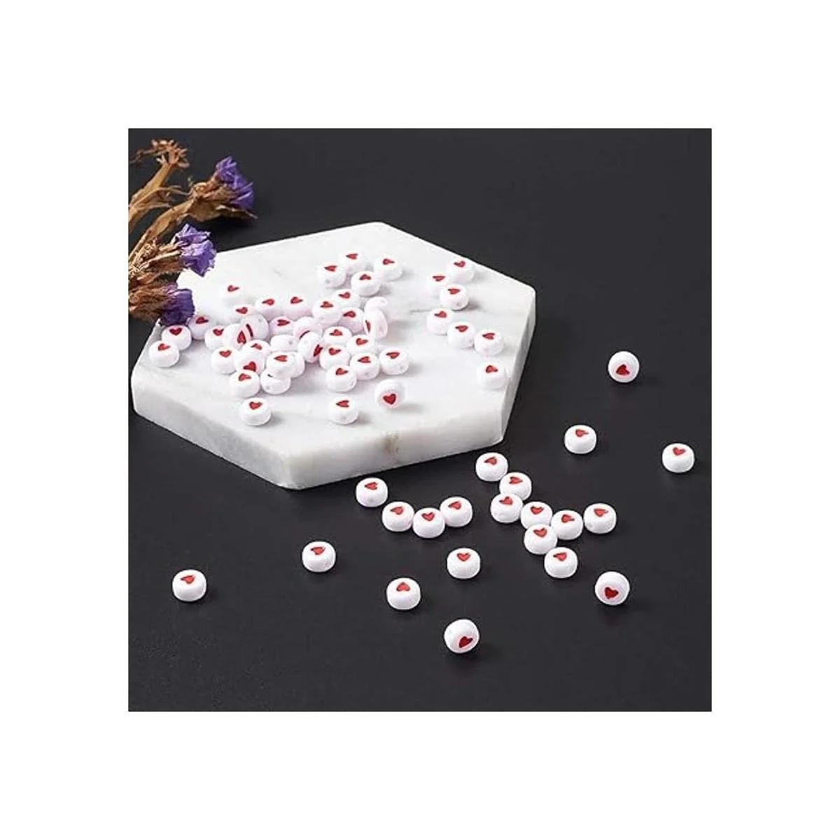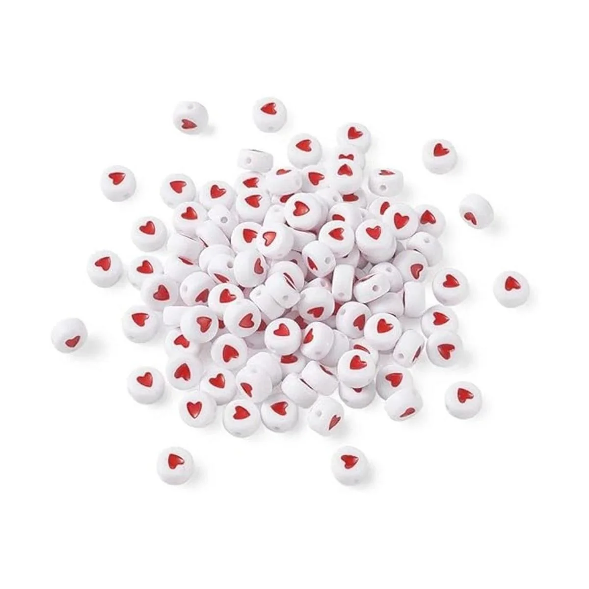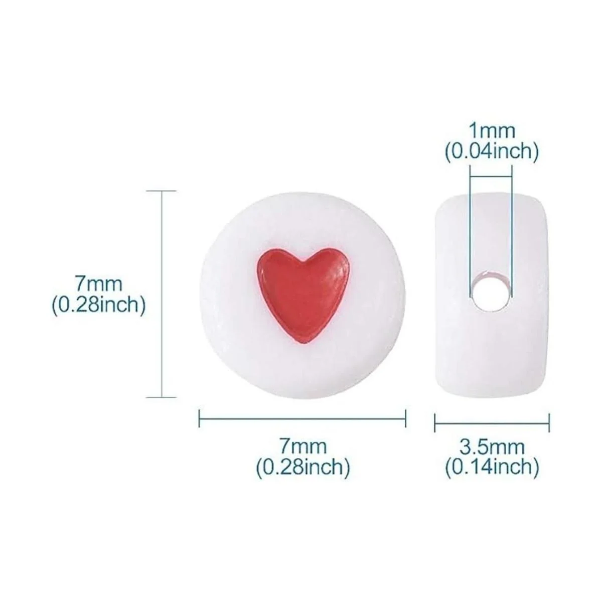 Pandahall 200 cuentas de corazón de acrílico blanco y rojo, plano, redondo, disco de corazón, moneda, cuentas de poni para bricolaje, mensaje de palabra, pulsera inicial, dijes espaciadores, joyería de 0.276 x 0.276 x 0.138 in