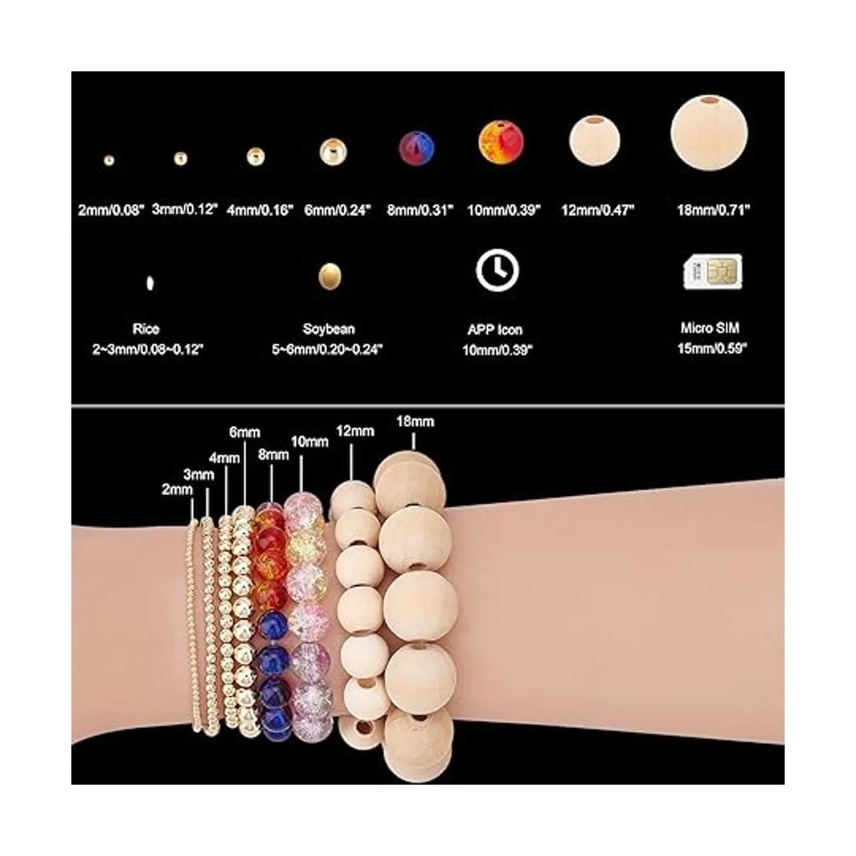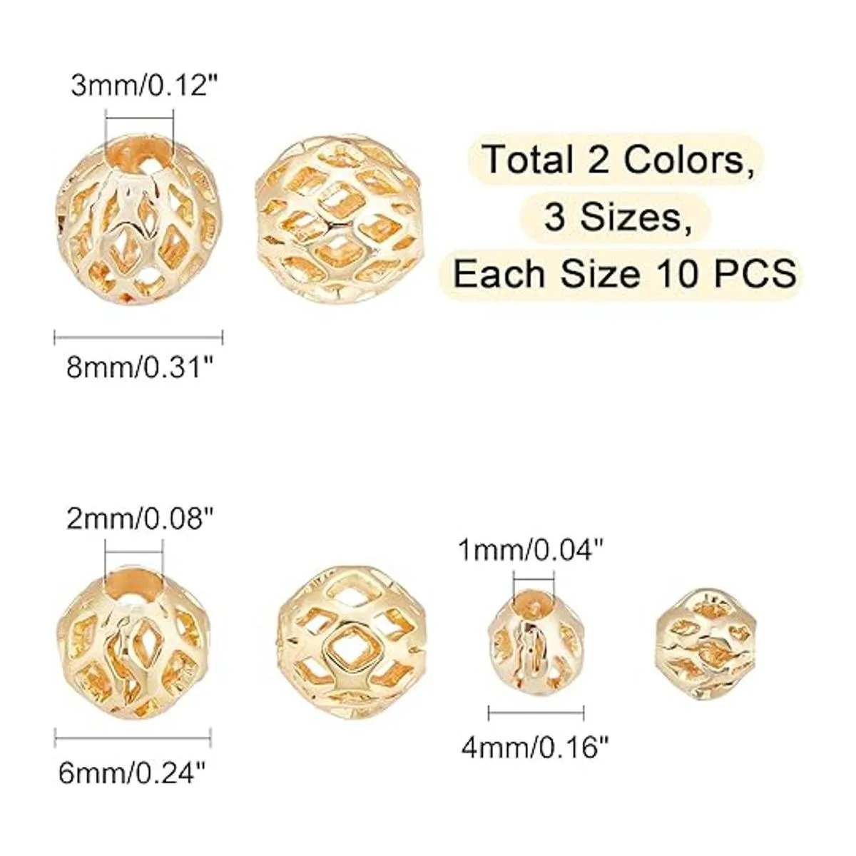 Medidas: cuentas redondas de 3 tamaños, 0.157 in, 0.236 in, 0.315 in de diámetro, agujero: 0.055 in, 0.079 in, 0.098 in. Las cuentas de diferentes tamaños se pueden aplicar para tus diversos proyectos. Ideal para decorar collares delicados, pulseras, pendientes, tobilleras y muchos adornos.