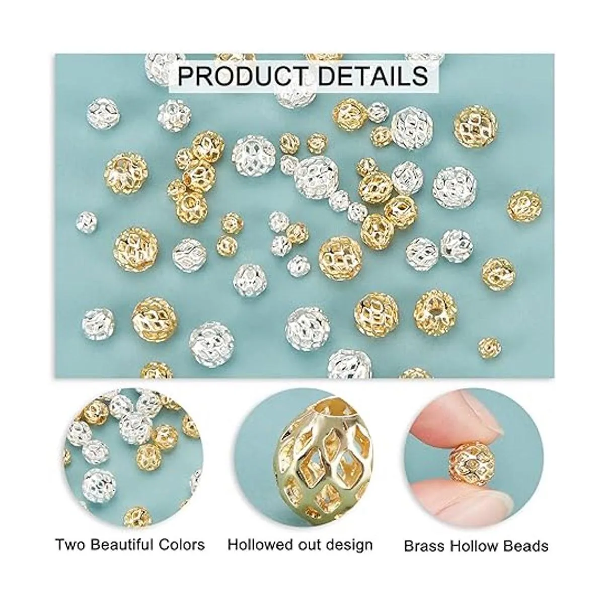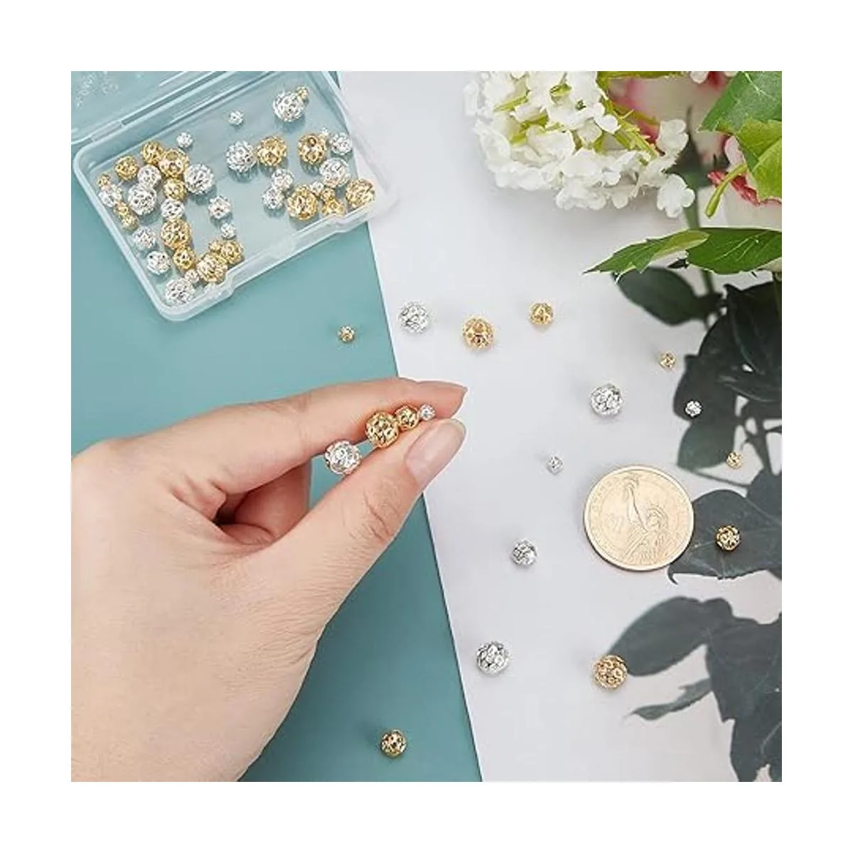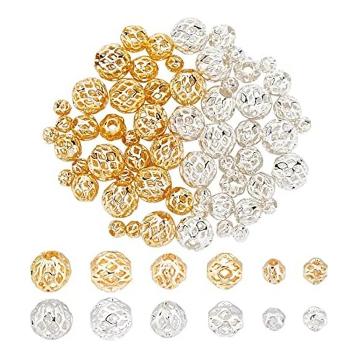 Cuentas de filigrana hueca: el paquete incluye 60 cuentas huecas: 30 cuentas de plata y 30 cuentas chapadas en oro de 18 quilates que cuentan con una forma redonda clásica y muestran un diseño de filigrana recortada.