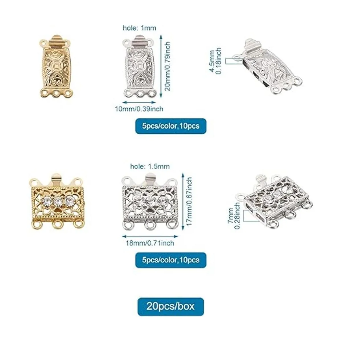 2 tipos: el paquete incluye 2 estilos de cierres rectangulares en color dorado y platino, 5 juegos/tipo de color, 20 juegos en total. Se puede combinar con tus diferentes estilos de joyas.
