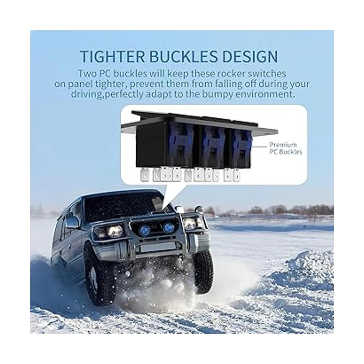 Diseño de hebillas más ajustadas Cada interruptor tiene una hebilla azul en ambos lados, son materiales de policarbonato de alta calidad, mantendrán los interruptores en el panel más apretados, evitando que los interruptores se caigan durante tu conducción, se adaptan perfectamente al entorno con baches.