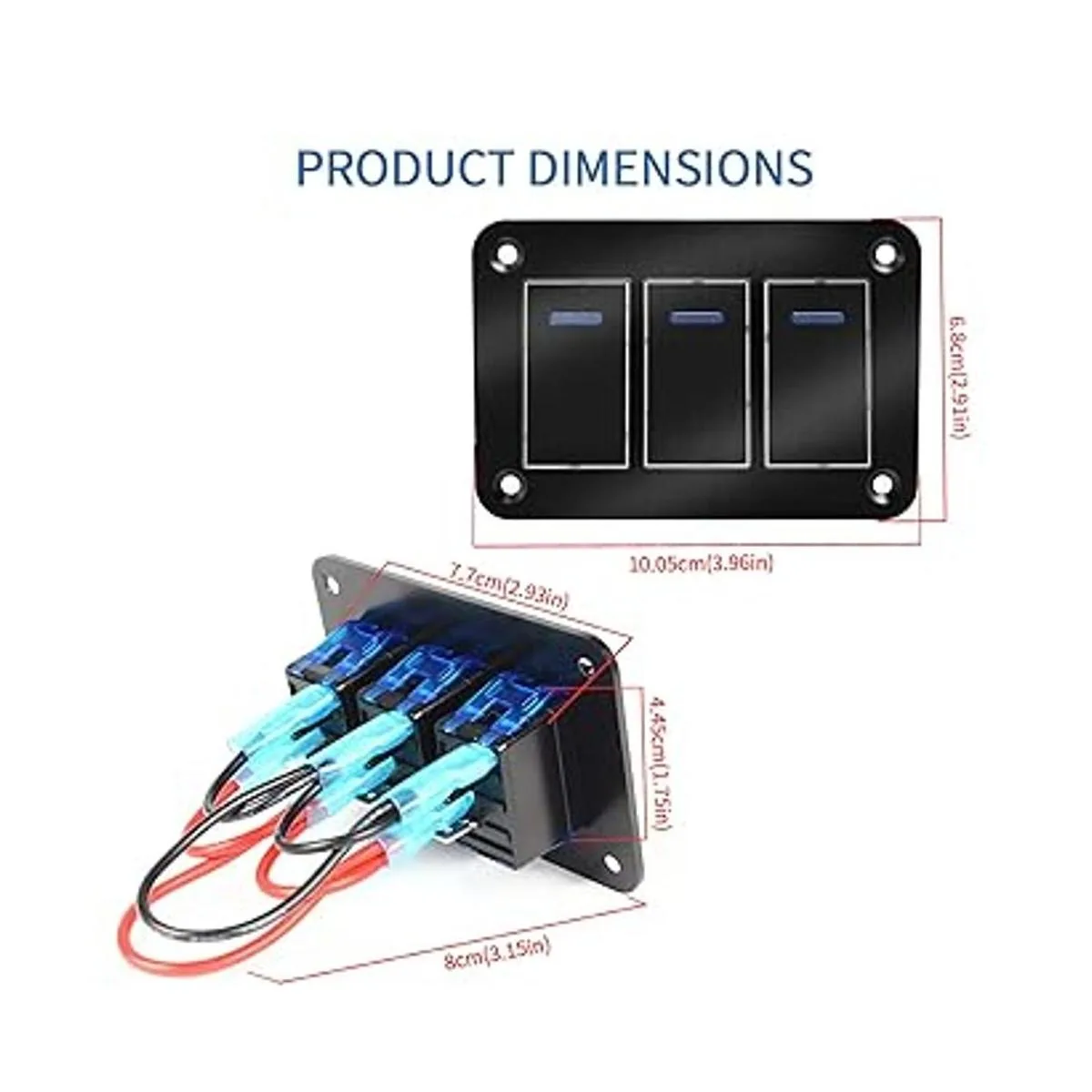 El panel de interruptores de 3 bandas se puede aplicar a voltaje de funcionamiento de CC 12 V o CC 24 V, el tamaño del panel de aluminio es de 3.96 x 2.68 pulgadas, tamaño del corte: 4.03 x 1.75 pulgadas, puede adaptarse a varios vehículos automotrices.