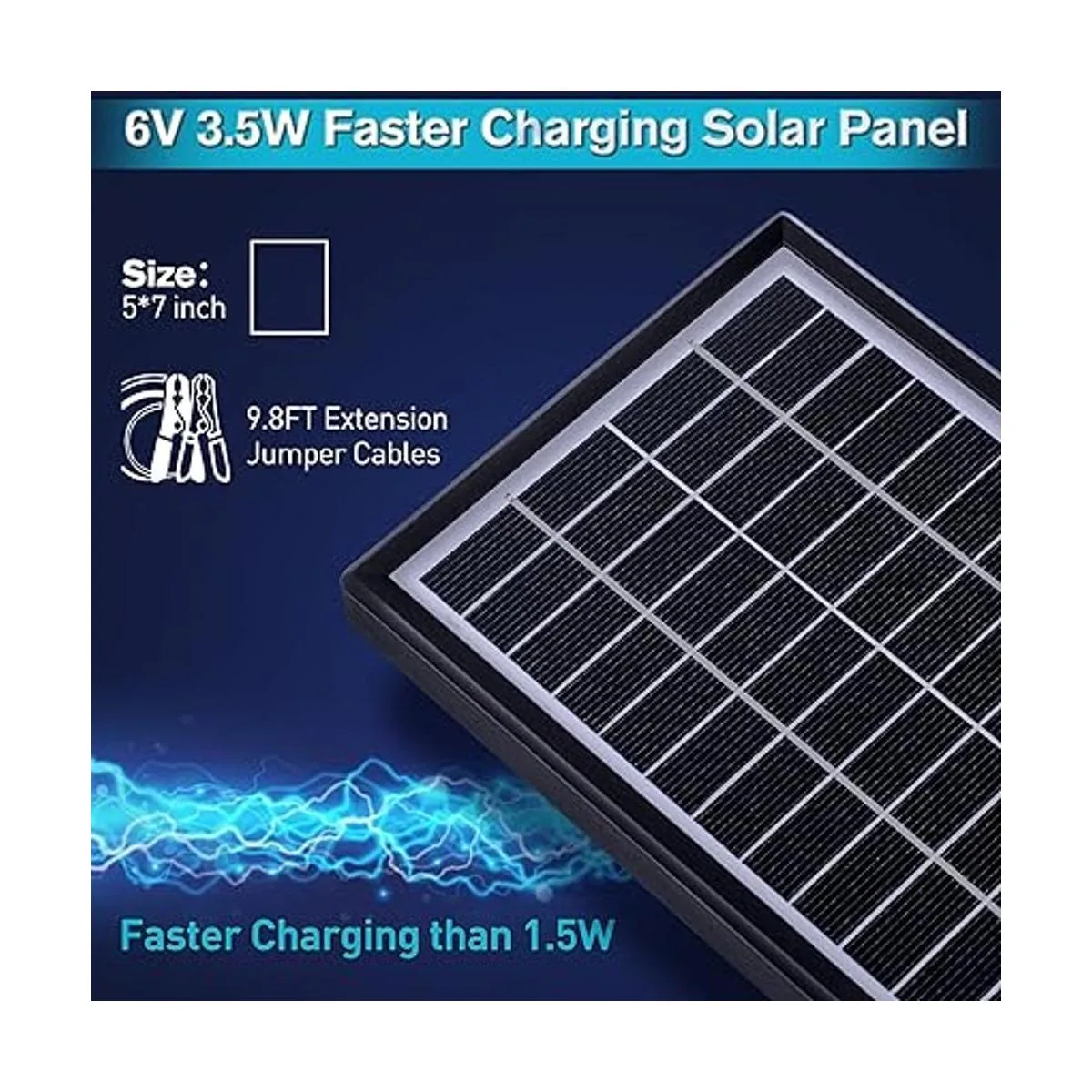 Cargador de batería de panel solar de 6 V y 3,5 W: este panel solar de 6 V y 3,5 W tiene una carga más rápida que el panel solar de 1,5 W, que convierte la luz solar en energía eléctrica y es compatible con múltiples dispositivos de batería como baterías de alimentación, baterías de equipo de caza, batería de coche, timbre, etc.