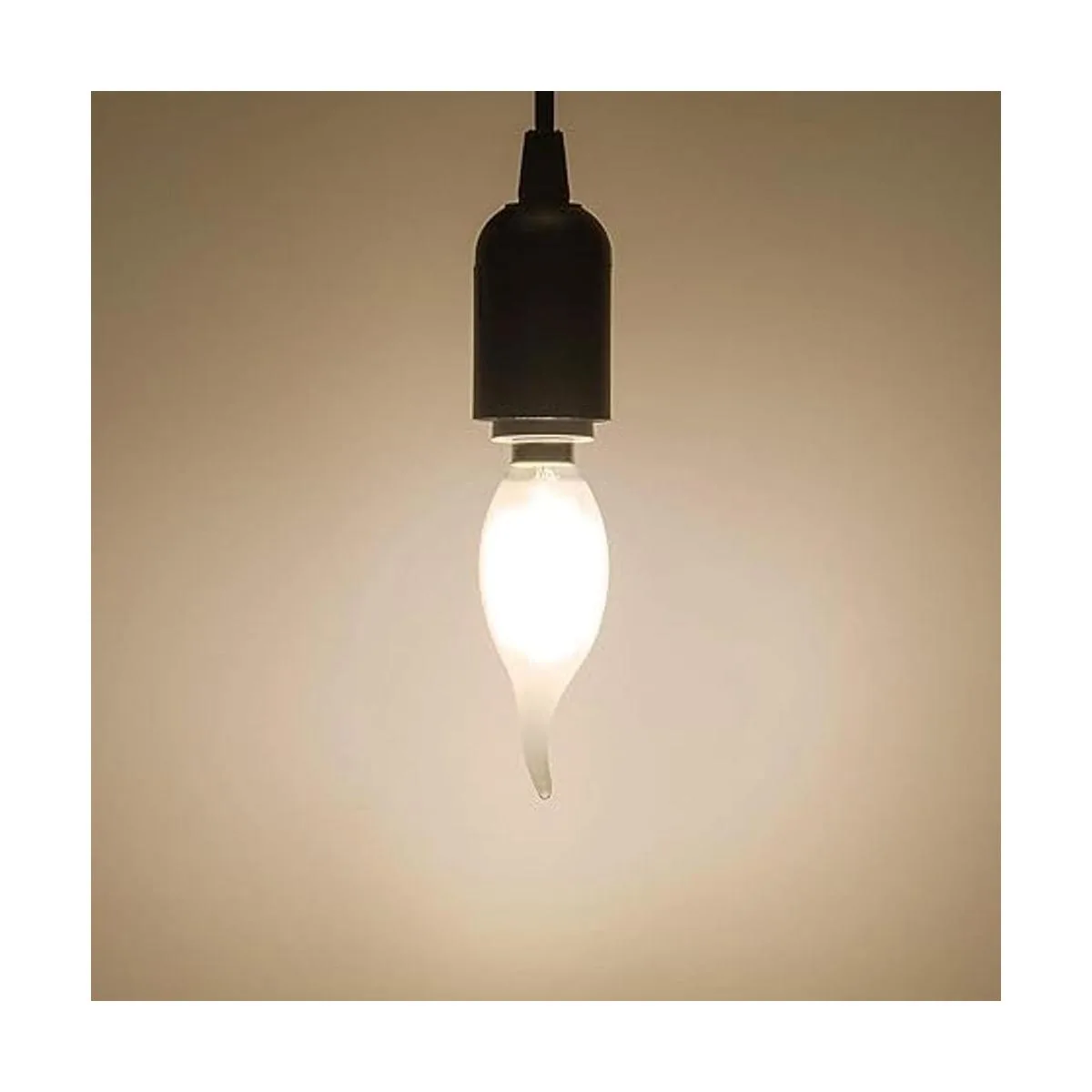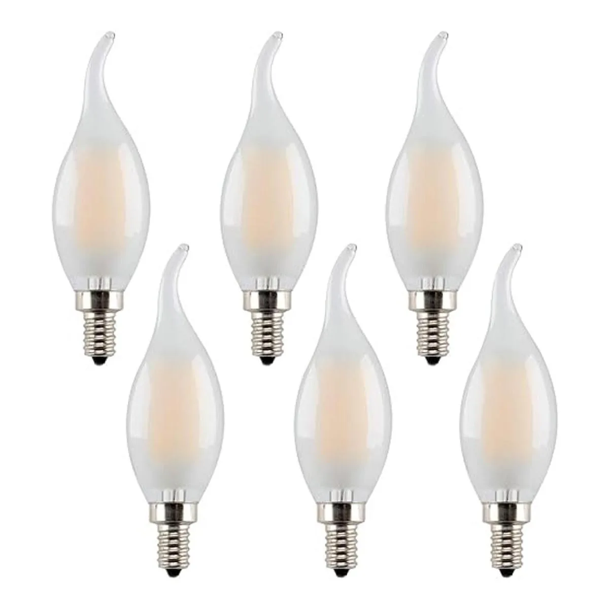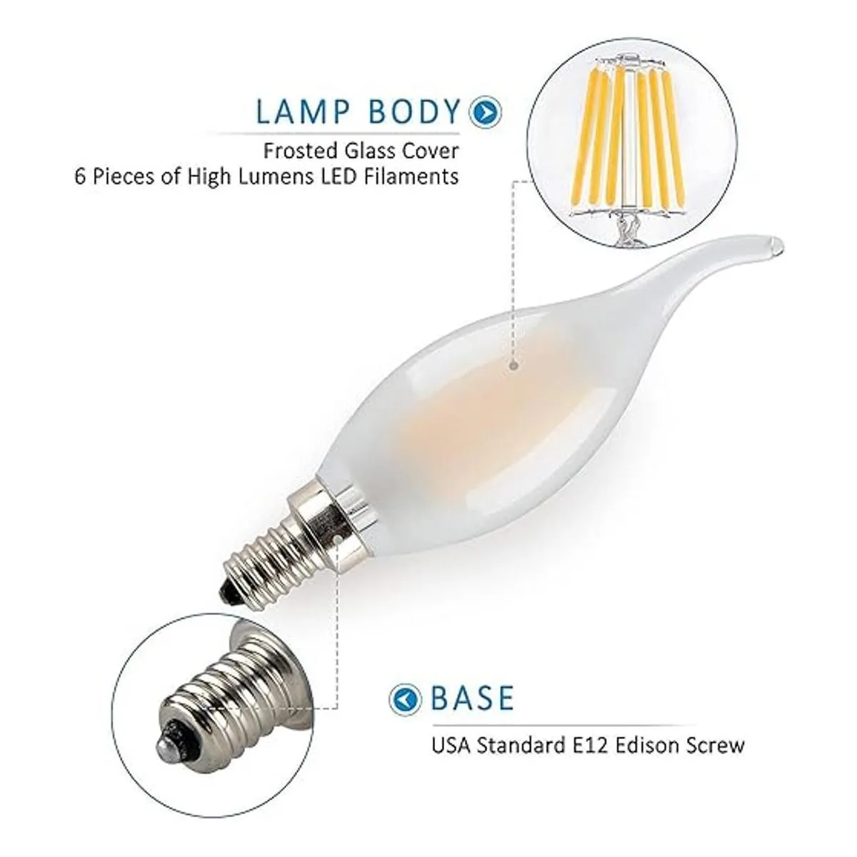 Características técnicas: cubierta de cristal esmerilado y lechoso regulable. Forma clásica de punta de llama estilo Edison. Filamento LED luz de vela, E12 Candelabra Base, AC 120 V, 2700 K blanco suave, 600 lúmenes