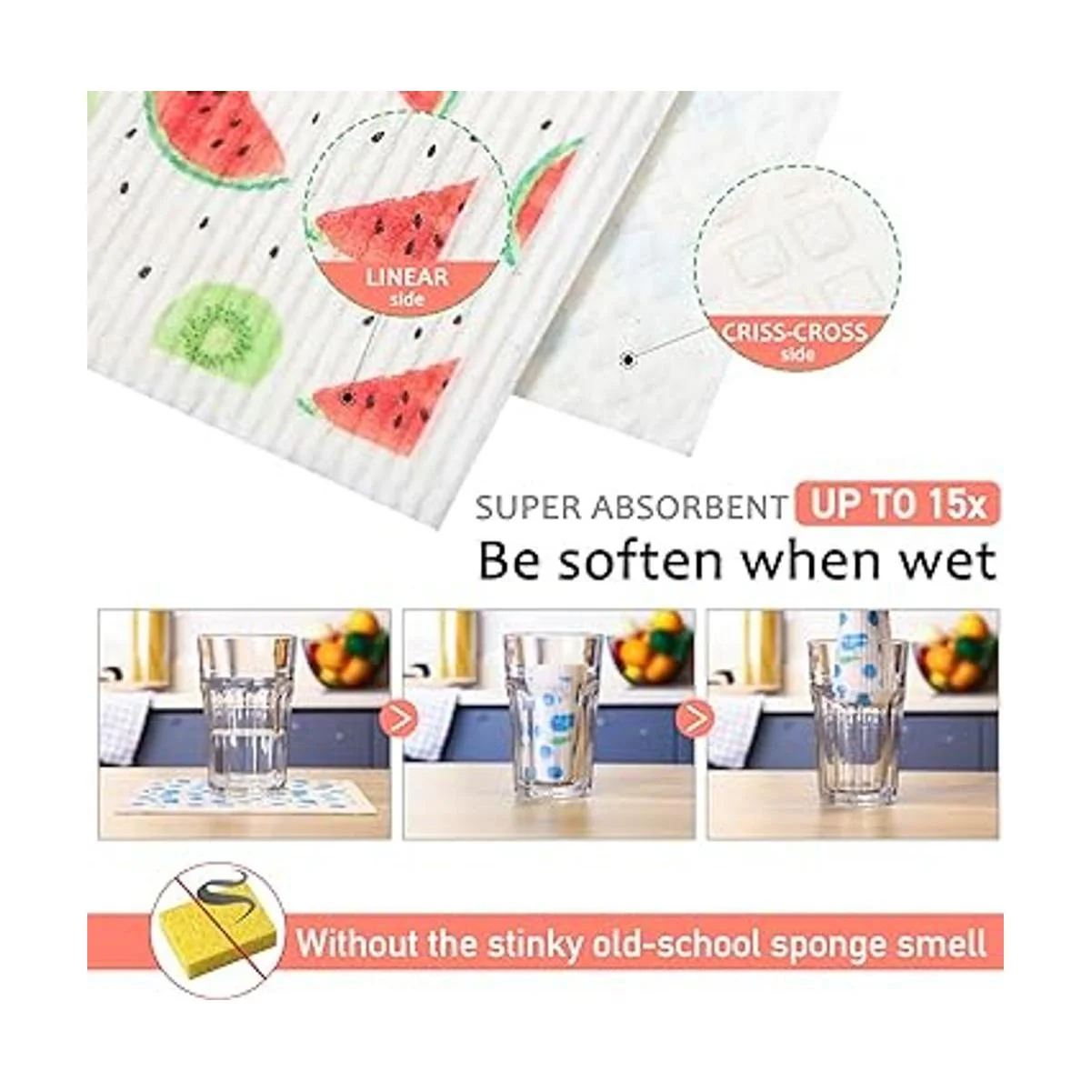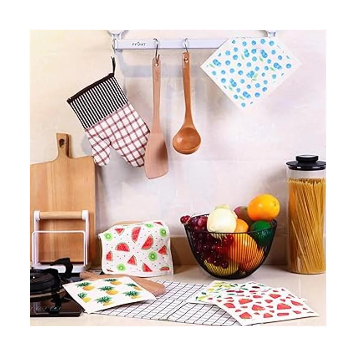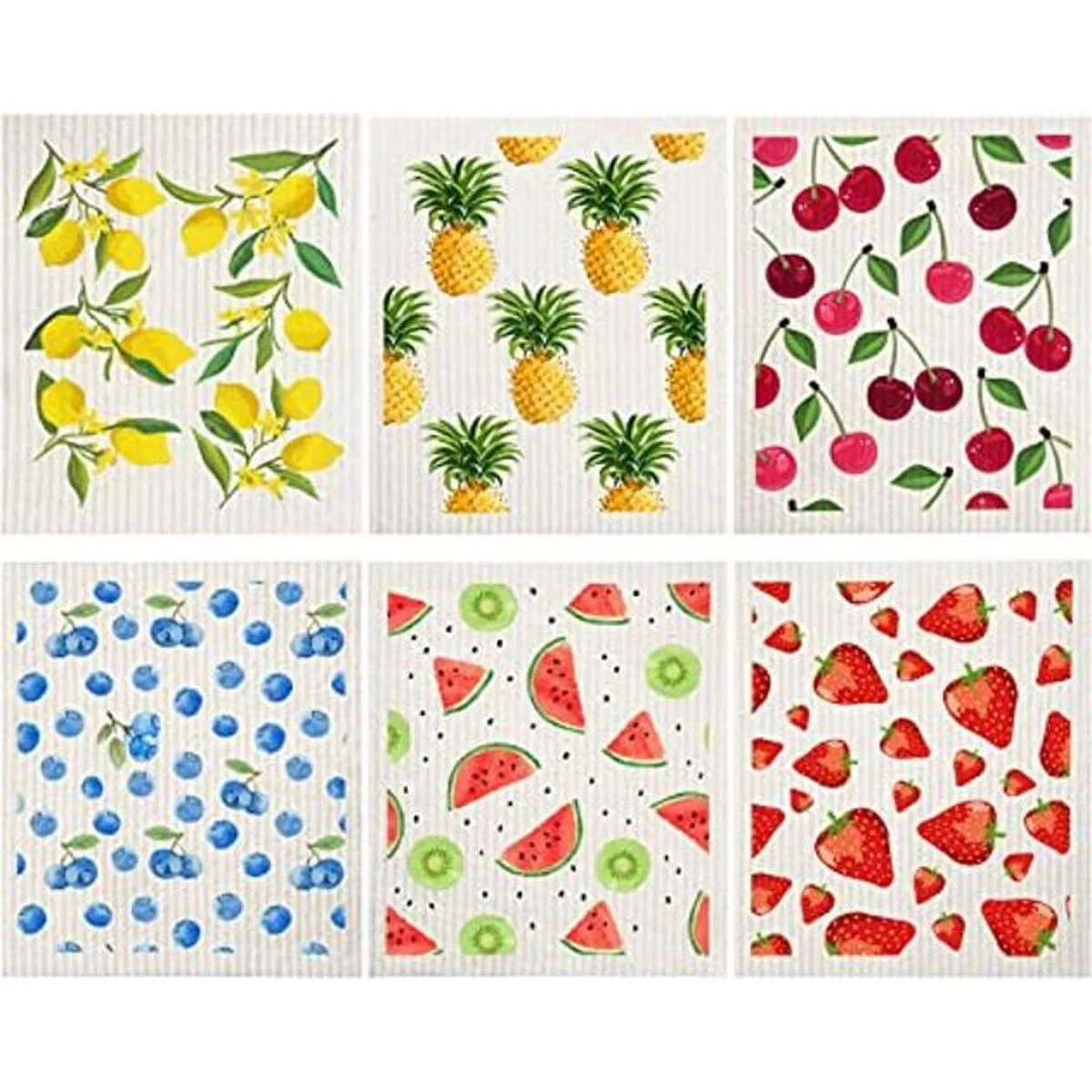 Paños de cocina suecos de frutas mixtas reutilizables paños de cocina absorbentes y de secado rápido, paños de limpieza para cocina, arándano, cereza, fresa, limón, piña, sandía 6 piezas