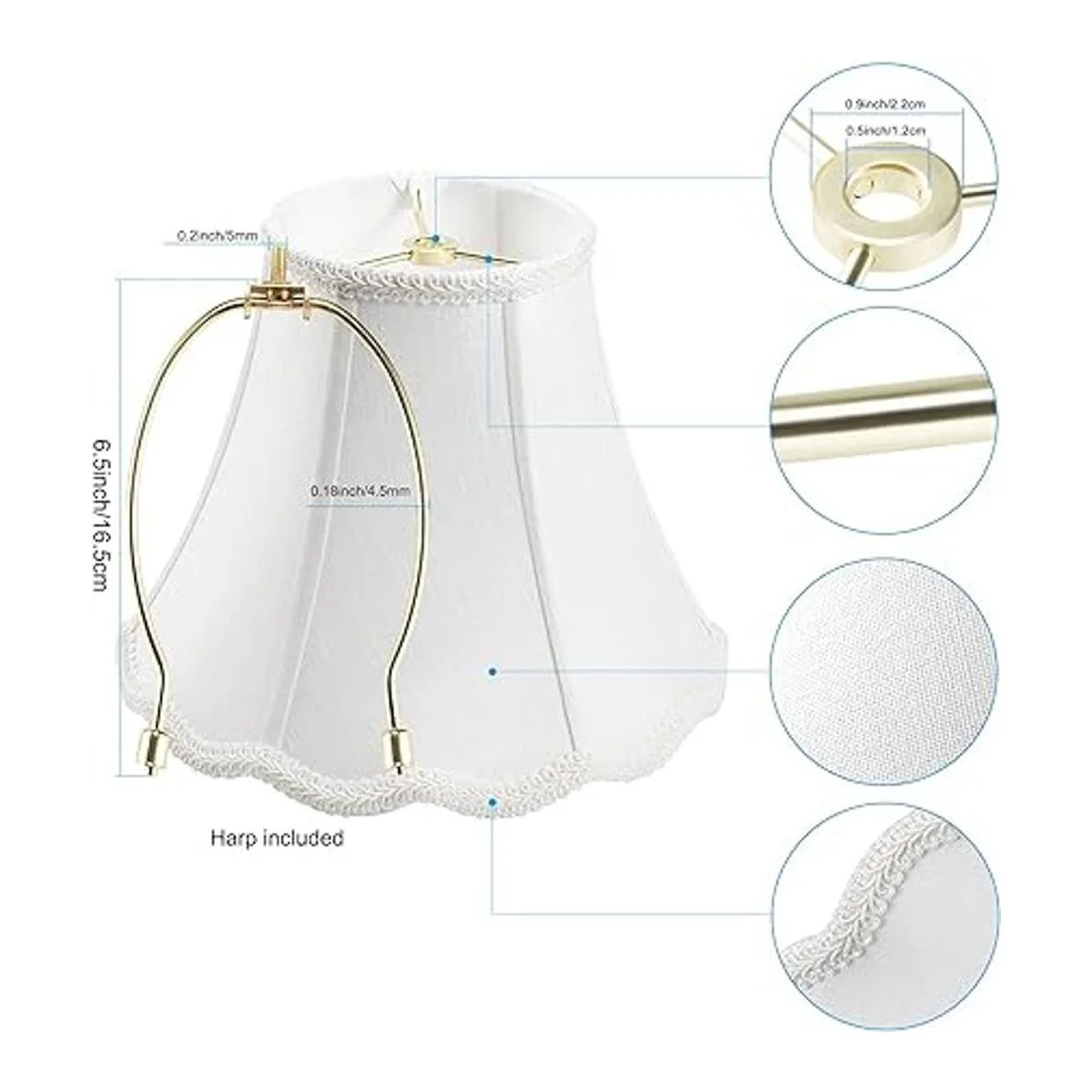Tamaño y forma Esta es una pantalla de lámpara blanca relativamente pequeña con forma de campana empaquetada con un juego de arpa ligera, base de sillín y remate. Diámetro de la parte superior: 5 pulgadas; diámetro de la parte inferior: 10 pulgadas; altura vertical 8 pulgadas; altura inclinada: 8.3 pulgadas;