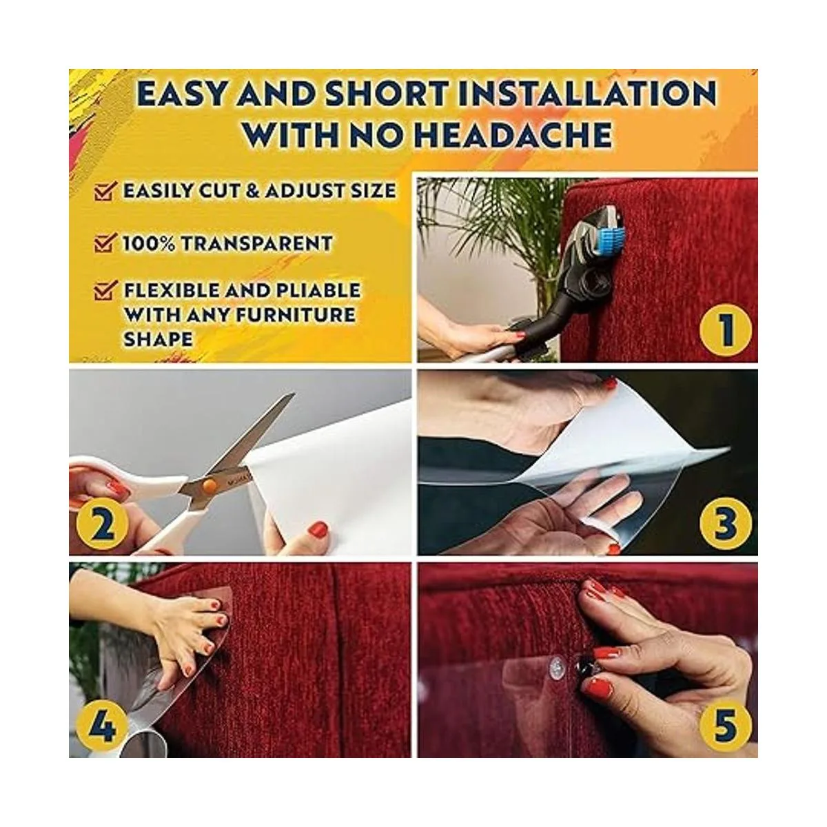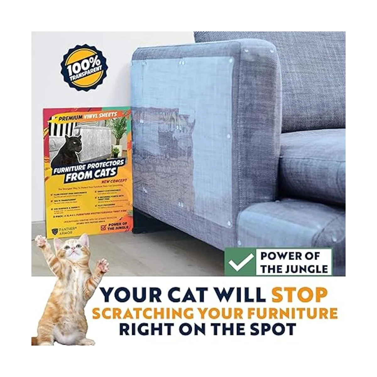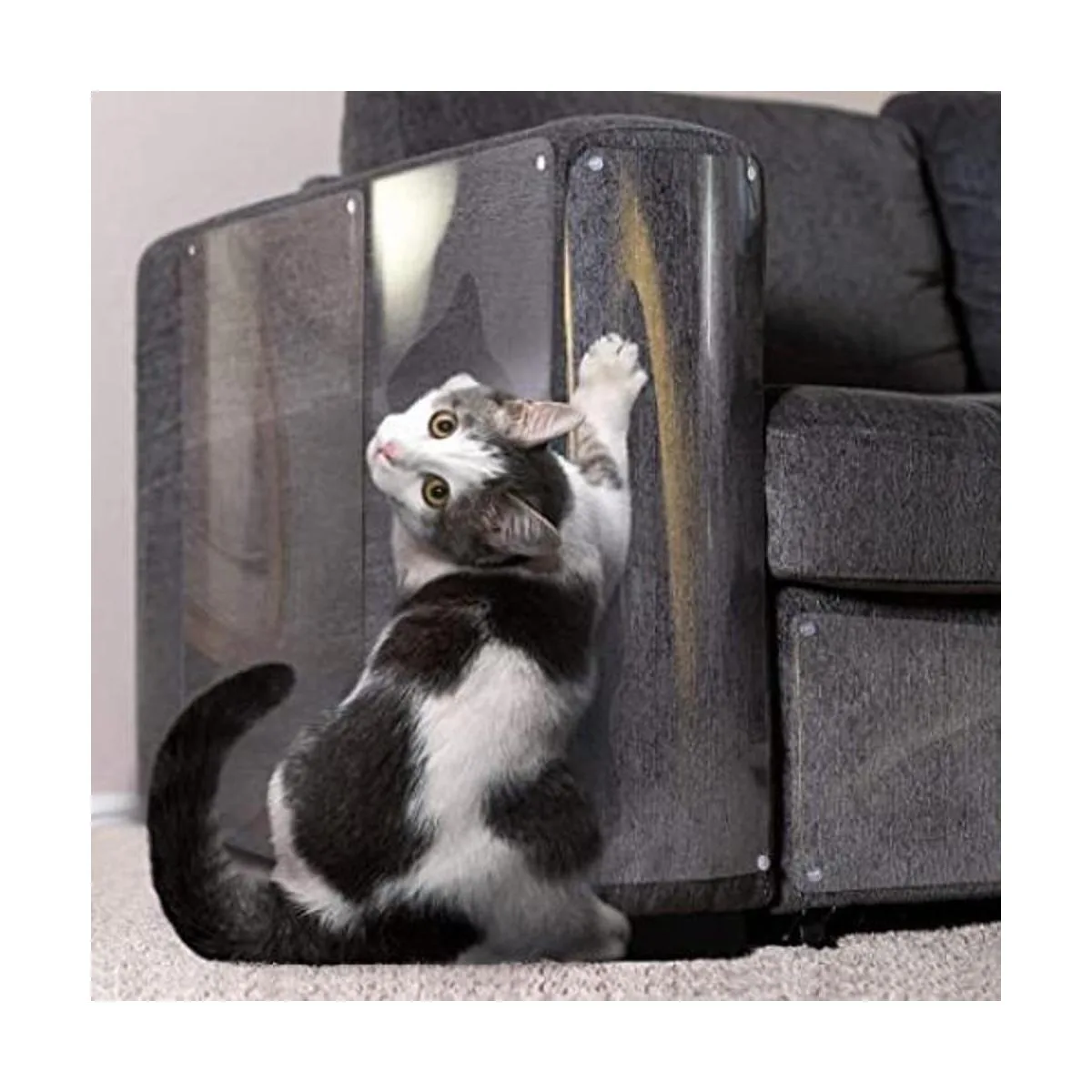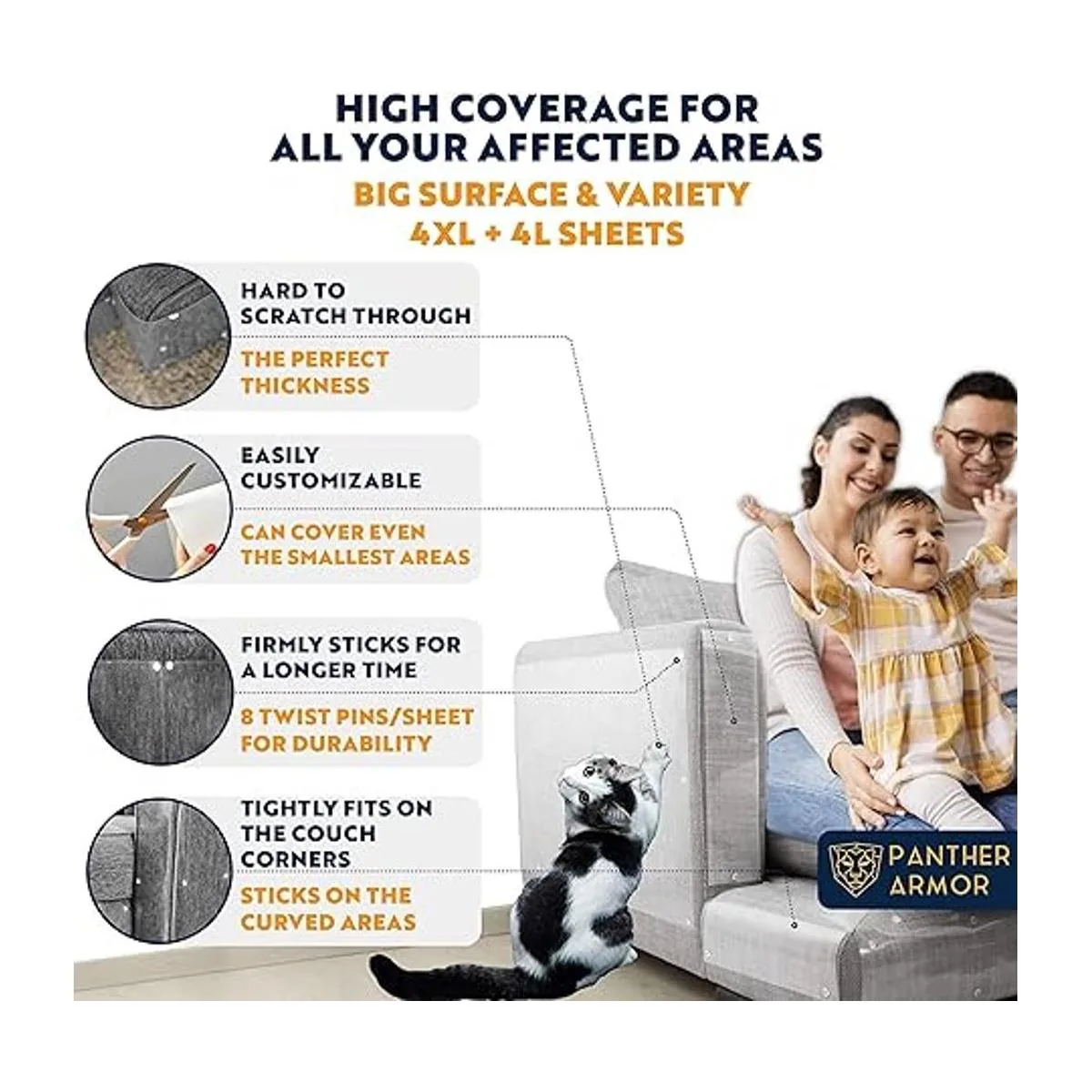 Mayor cobertura: la armadura de pantera cubre una superficie más alta de los muebles contra arañazos de gatos. Un juego completo incluye 8 protectores de muebles antiarañazos: 4 piezas XL de 17 pulgadas de largo y 12 pulgadas de ancho 4 hojas autoadhesivas grandes de 17 pulgadas de largo y 10 pulgadas de ancho y 64 pasadores giratorios. Los 8 pines ofrecen una garantía adicional de que las sábanas transparentes se pegarán a los muebles y protegerán tu tapicería de tela de daños en garras de mascotas. Este repelente de arañazos para gatos se pegará en muebles de cuero o madera sin usar alfileres.