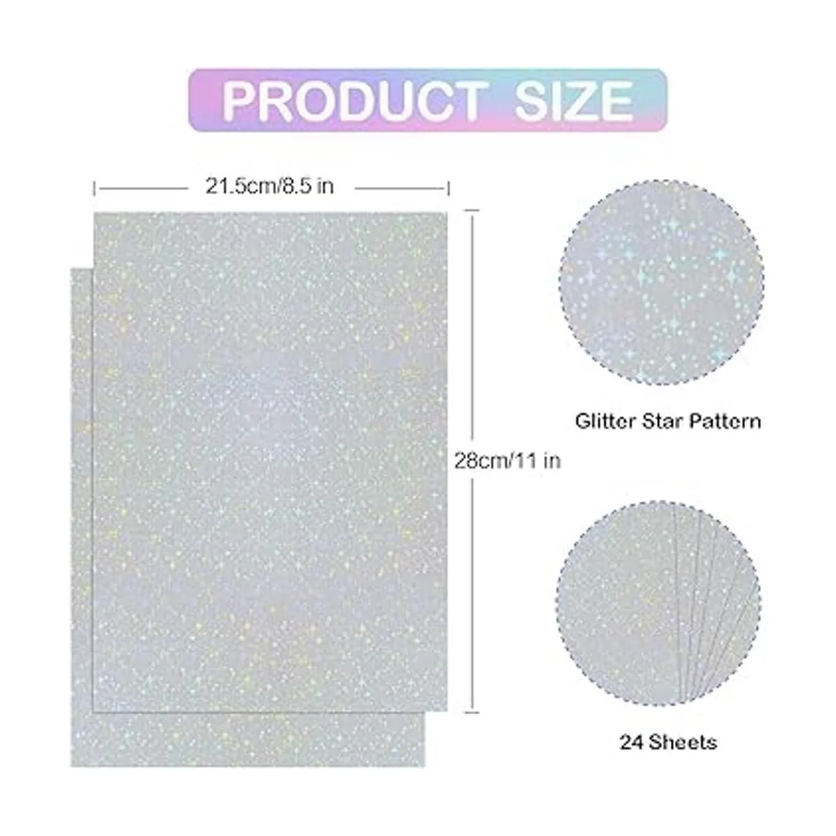 Papel adhesivo holográfico, 24 hojas de papel holográfico de 8.5 x 11 pulgadas, hojas de vinilo autoadhesivas transparentes, holográficas, laminadas permanentes para calcomanías, manualidades, tamaño carta de EE. UU. patrón de estrella