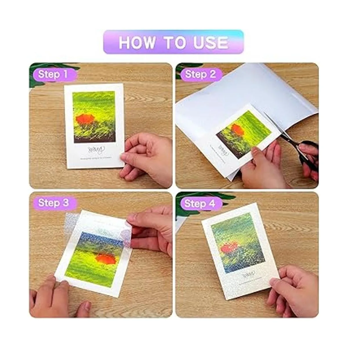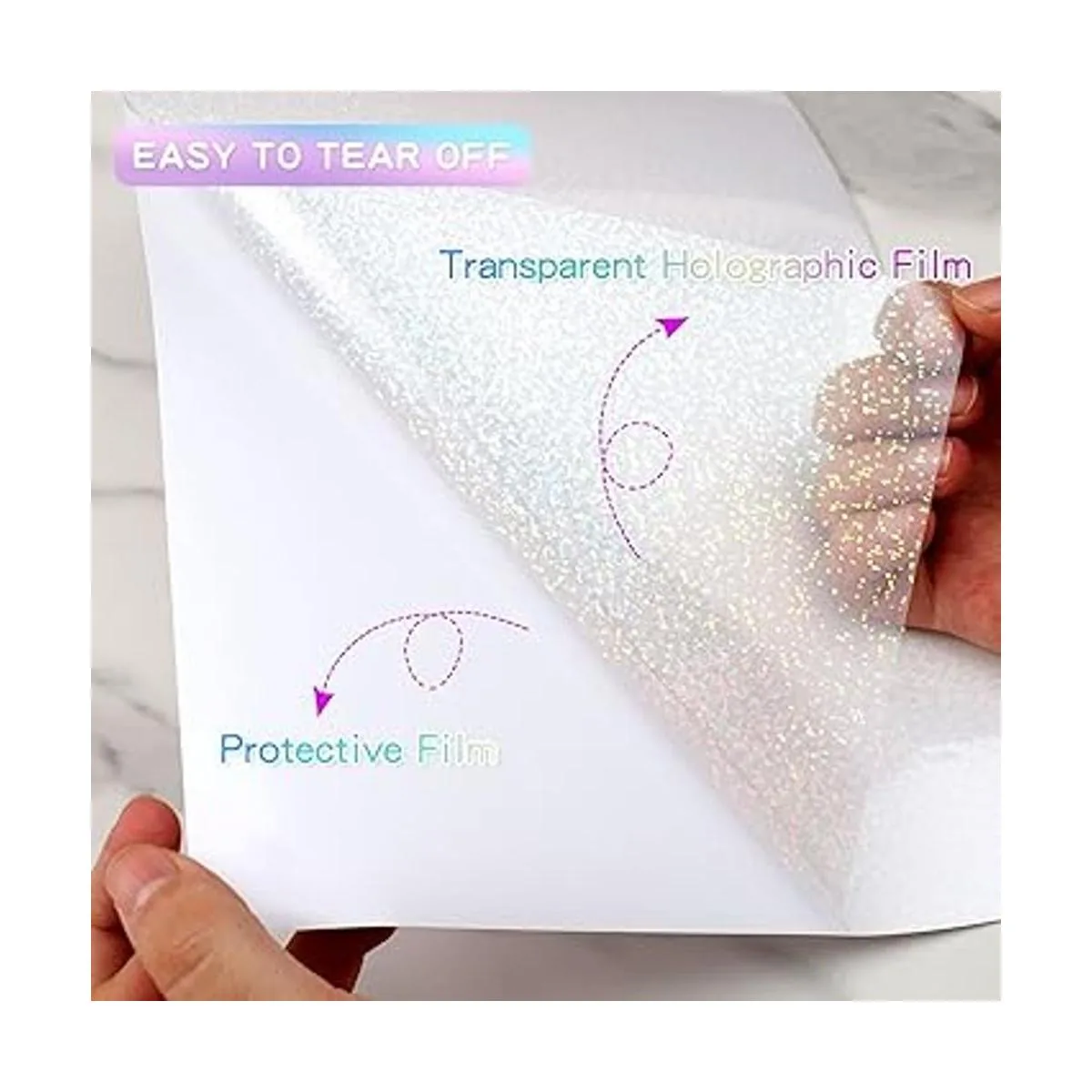 Fácil de usar: las hojas de papel adhesivas holográficas se pueden quitar fácilmente sin dejar residuos pegajosos, se pueden pegar firmemente a todo tipo de objetos lisos, fáciles de cortar con tijeras o una máquina de corte, y también son lo suficientemente adhesivas como para adherirse firmemente a la superficie, haciendo que las calcomanías holográficas transparentes sean más simples y fluidas