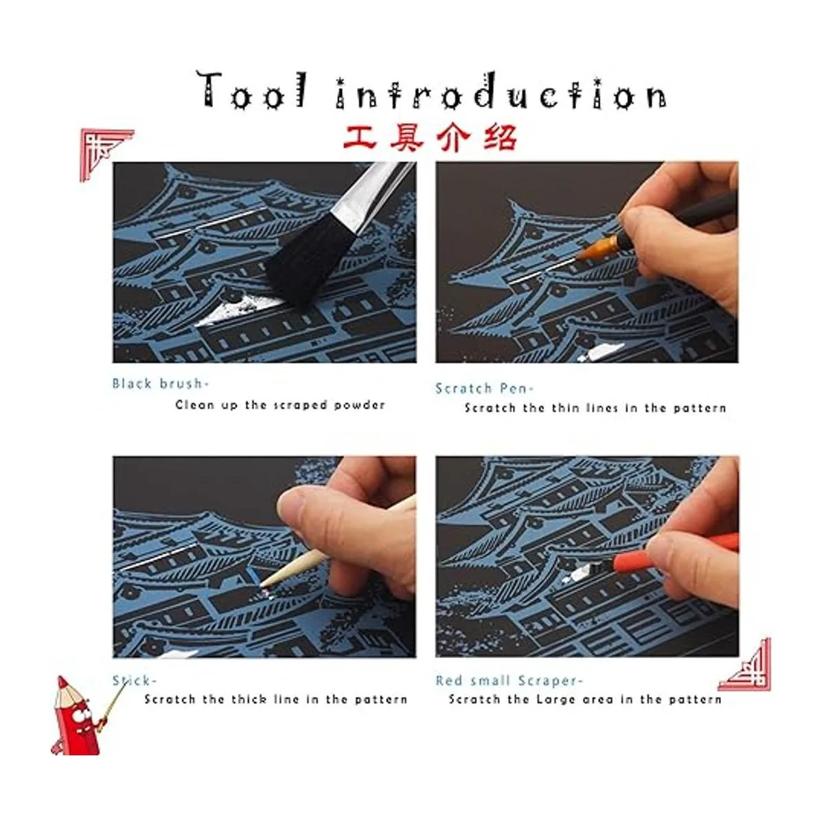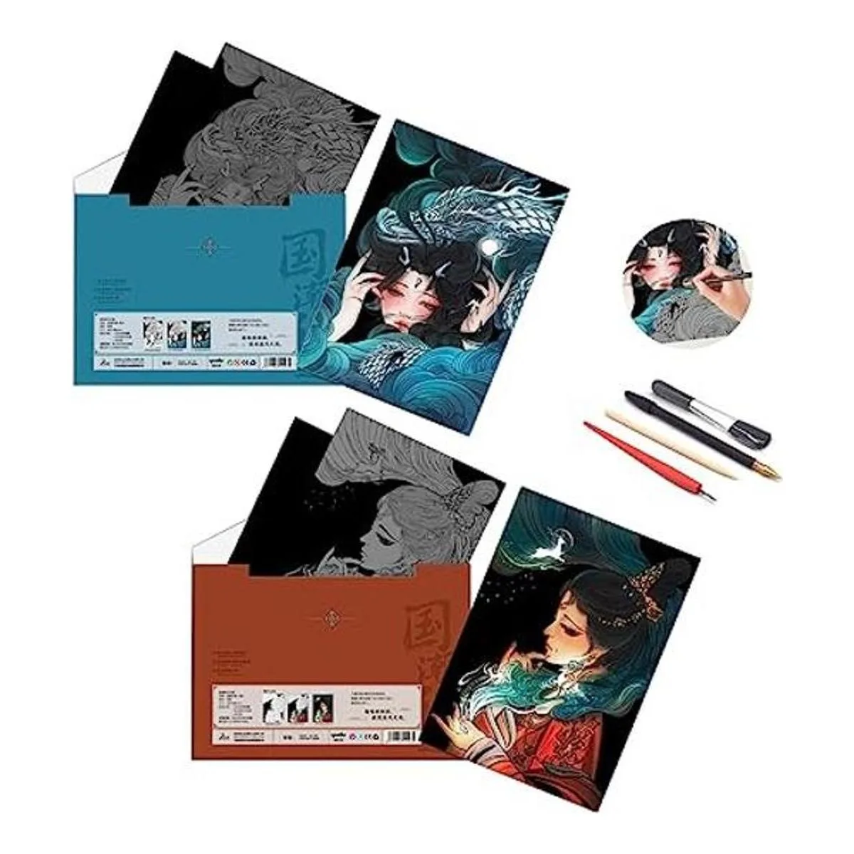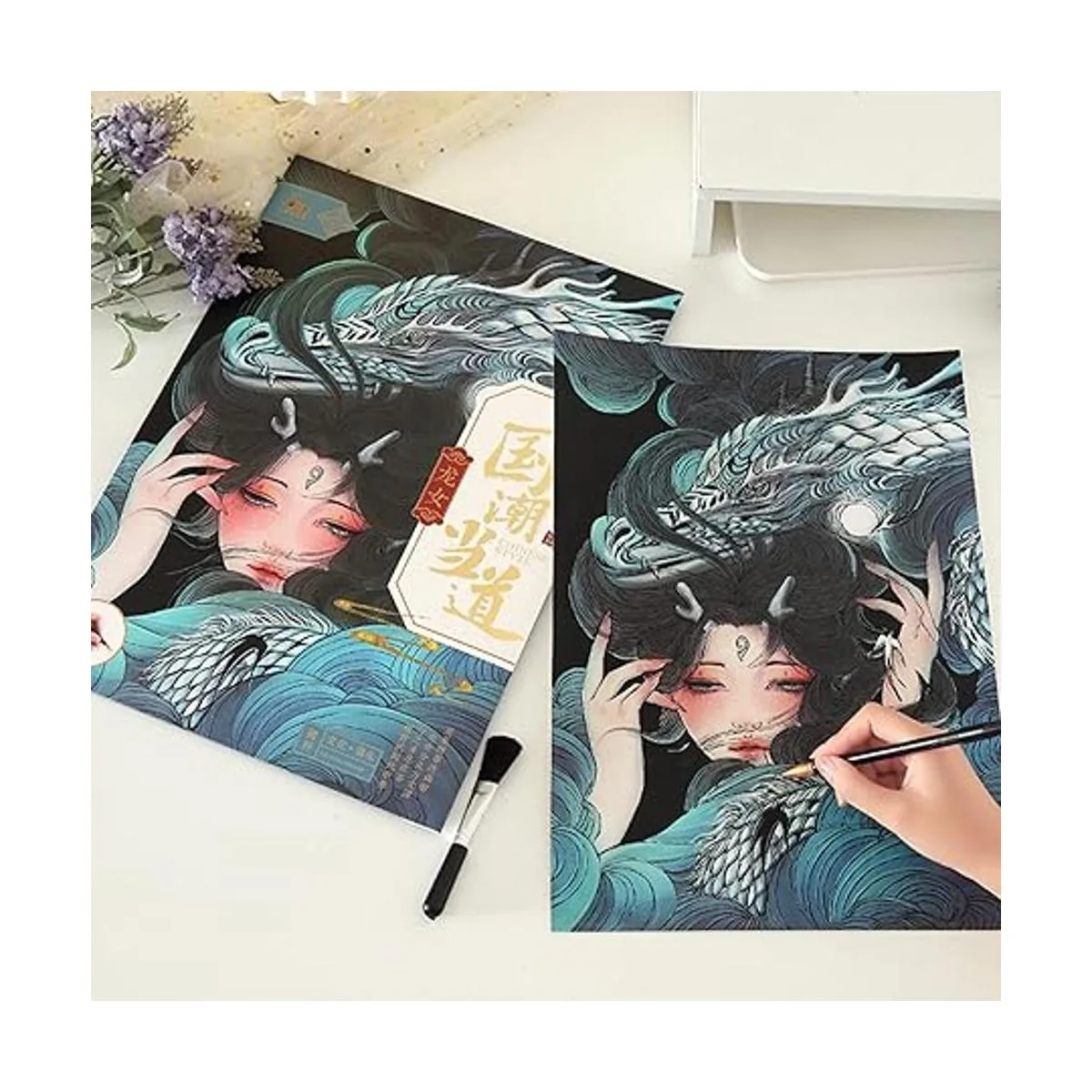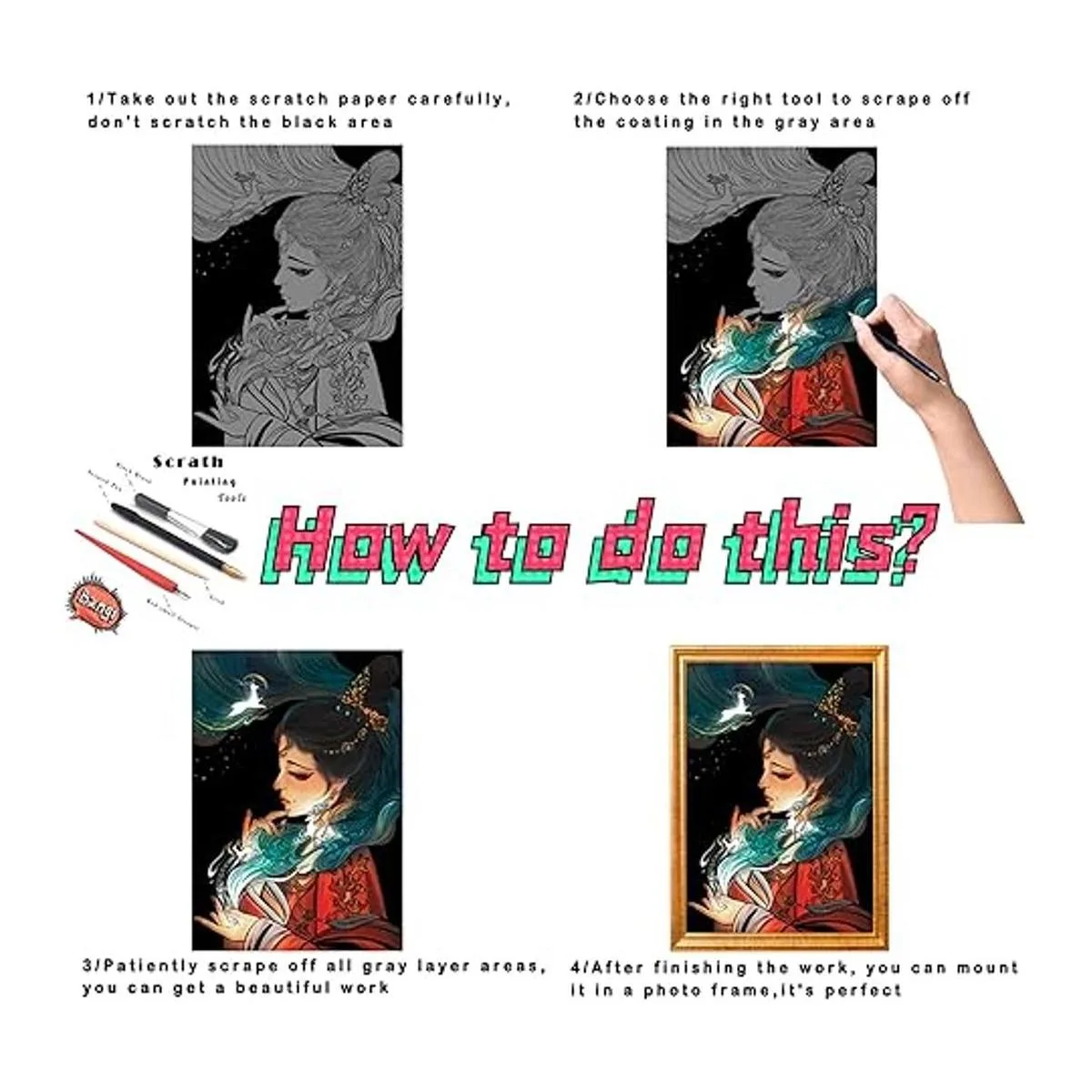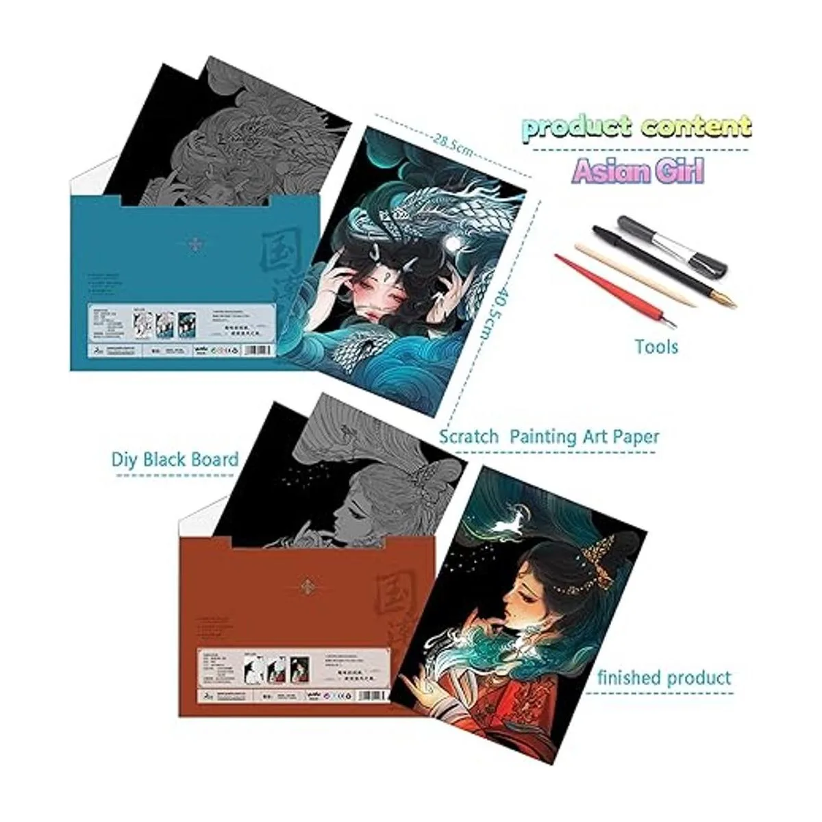Papel de arte para pintura de arco iris a rayar, arte y boceto para niños y adultos, juego de arte y manualidades, bloc de bocetos, tablero de rascador de bricolaje con 4 herramientas, 11.7 x 8.3 pulgadas chica asiática