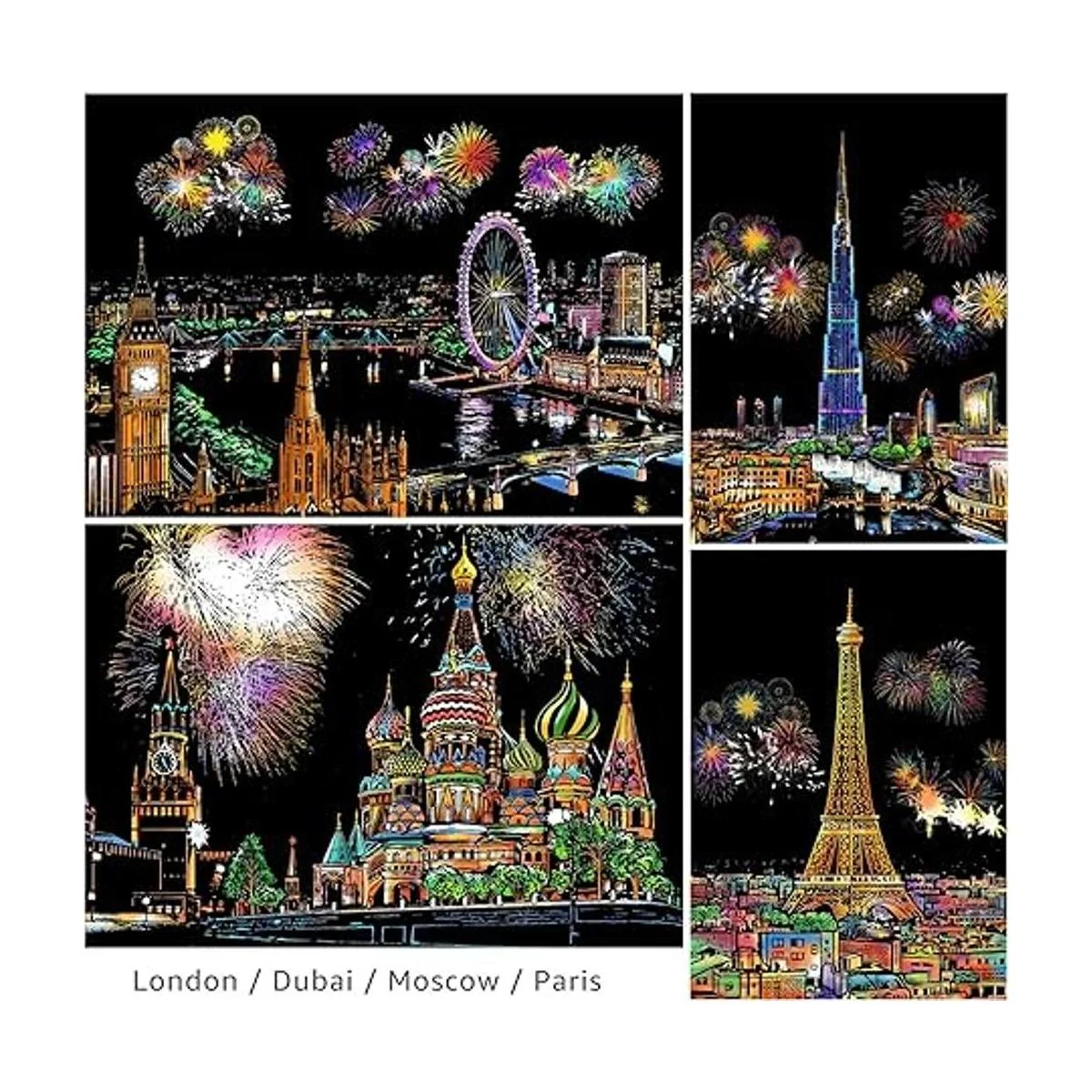 Papel de pintura Arco Iris A4, manualidades de bricolaje para mujer, pintura para arañazos para niños y adultos, Día de Acción de Gracias y Navidad cumpleaños Juego de regalo creativo 8 hojas edificio clásico de la ciudad