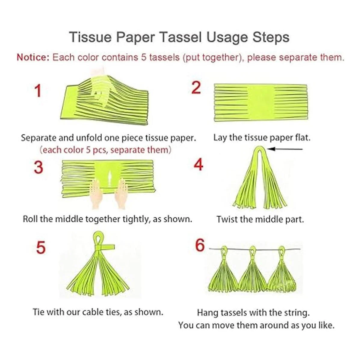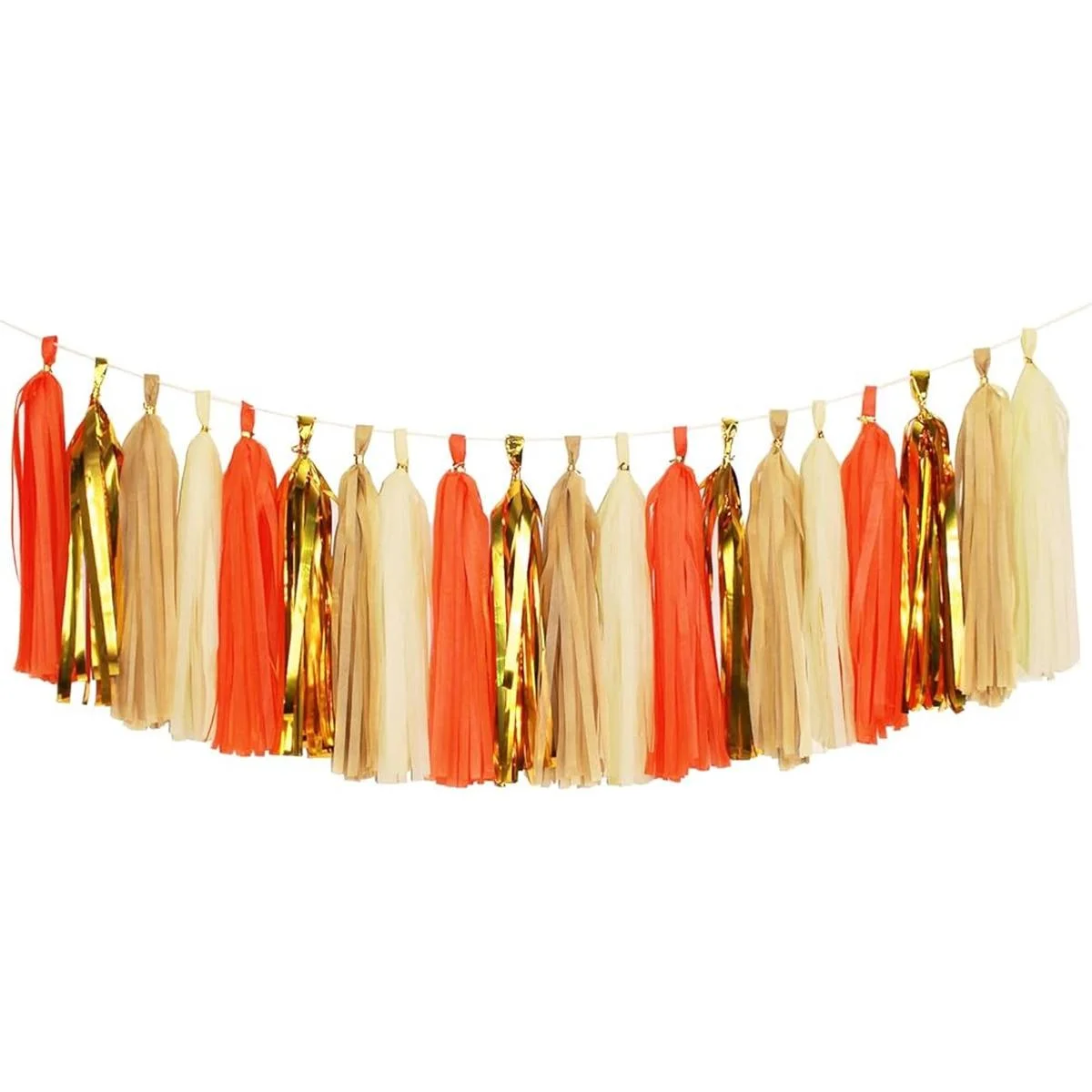 Embalaje, una guirnalda incluye: 20 borlas 14 inch de largo cada uno instrucciones cuerda Free bridas para colgar estas borlas, 5 de cada color kraft café claro, naranja, blanco y dorado metálico.