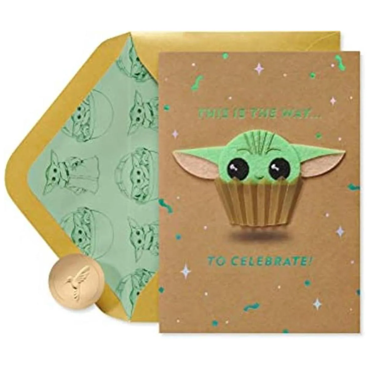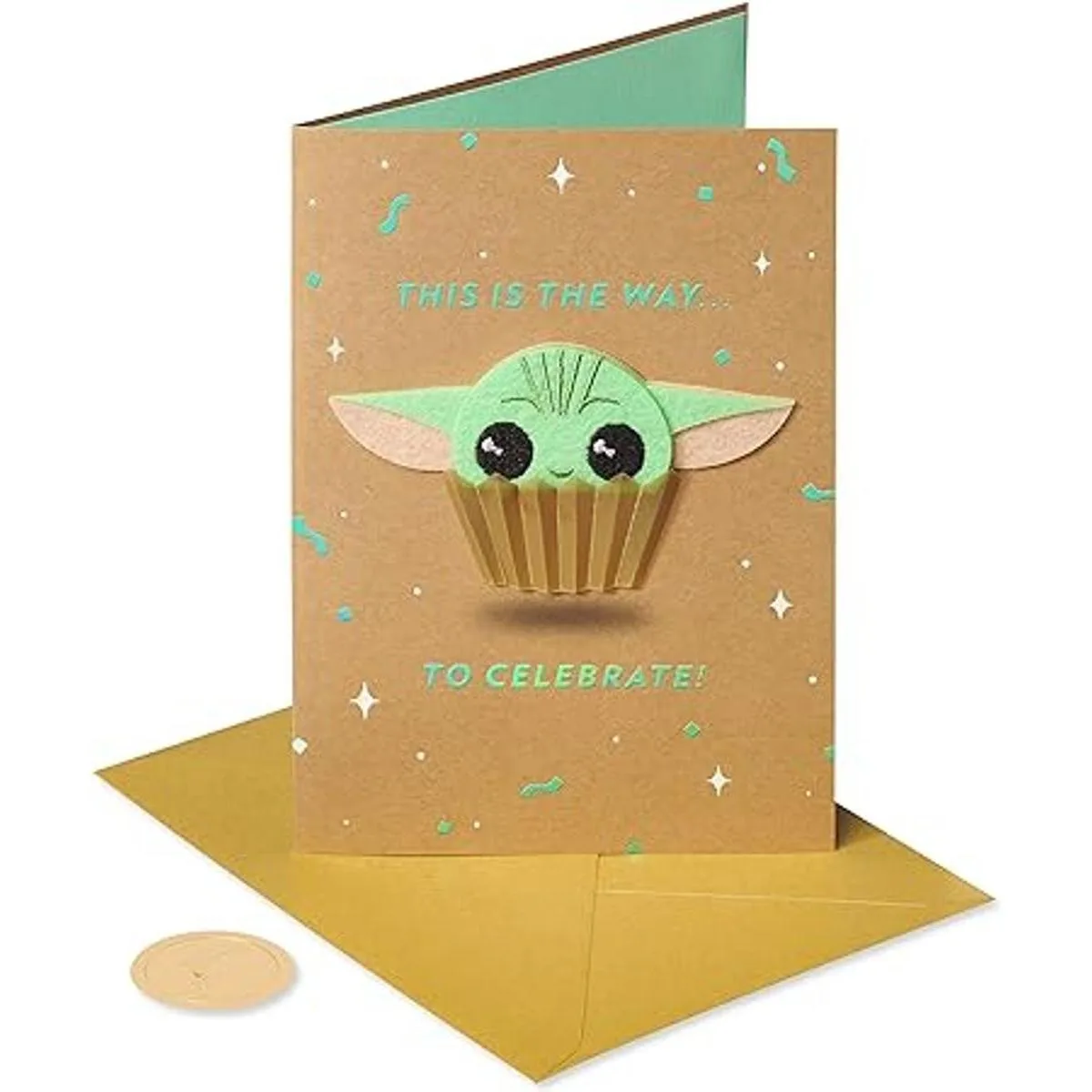 Esta bonita tarjeta de cumpleaños de Papyrus cuenta con Baby Yoda con papel de aluminio brillante, fieltro, costuras, una superposición de papel translúcido y accesorios de papel de calidad