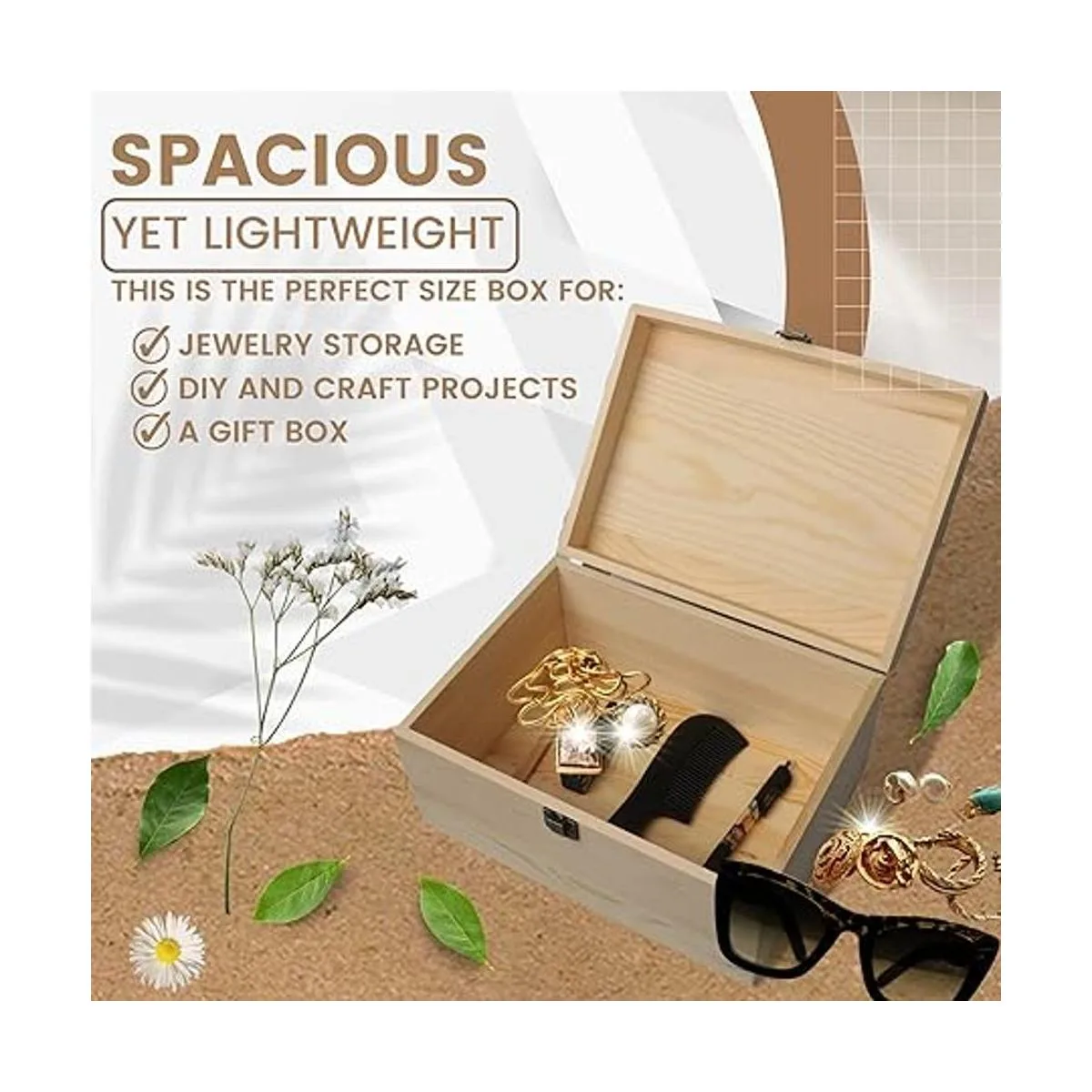 Espaciosa pero ligera, esta caja de madera es perfecta para tus necesidades de almacenamiento y manualidades. Esta es la caja de tamaño perfecto para almacenamiento de joyas, proyectos de bricolaje y manualidades, y como una caja de regalo