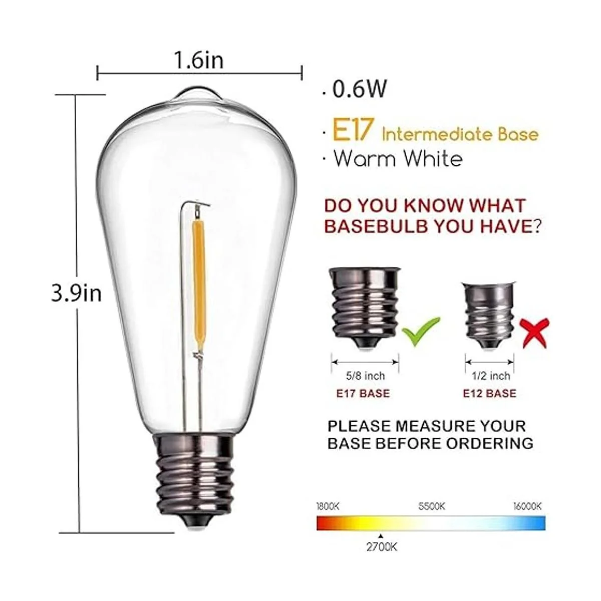 Paquete de 10 bombillas LED Edison, bombillas de repuesto de base de tornillo E17 de 0.6 vatios, bombillas LED inastillables ST40 de plástico transparente para patio al aire libre, luces ST40, color blanco cálido