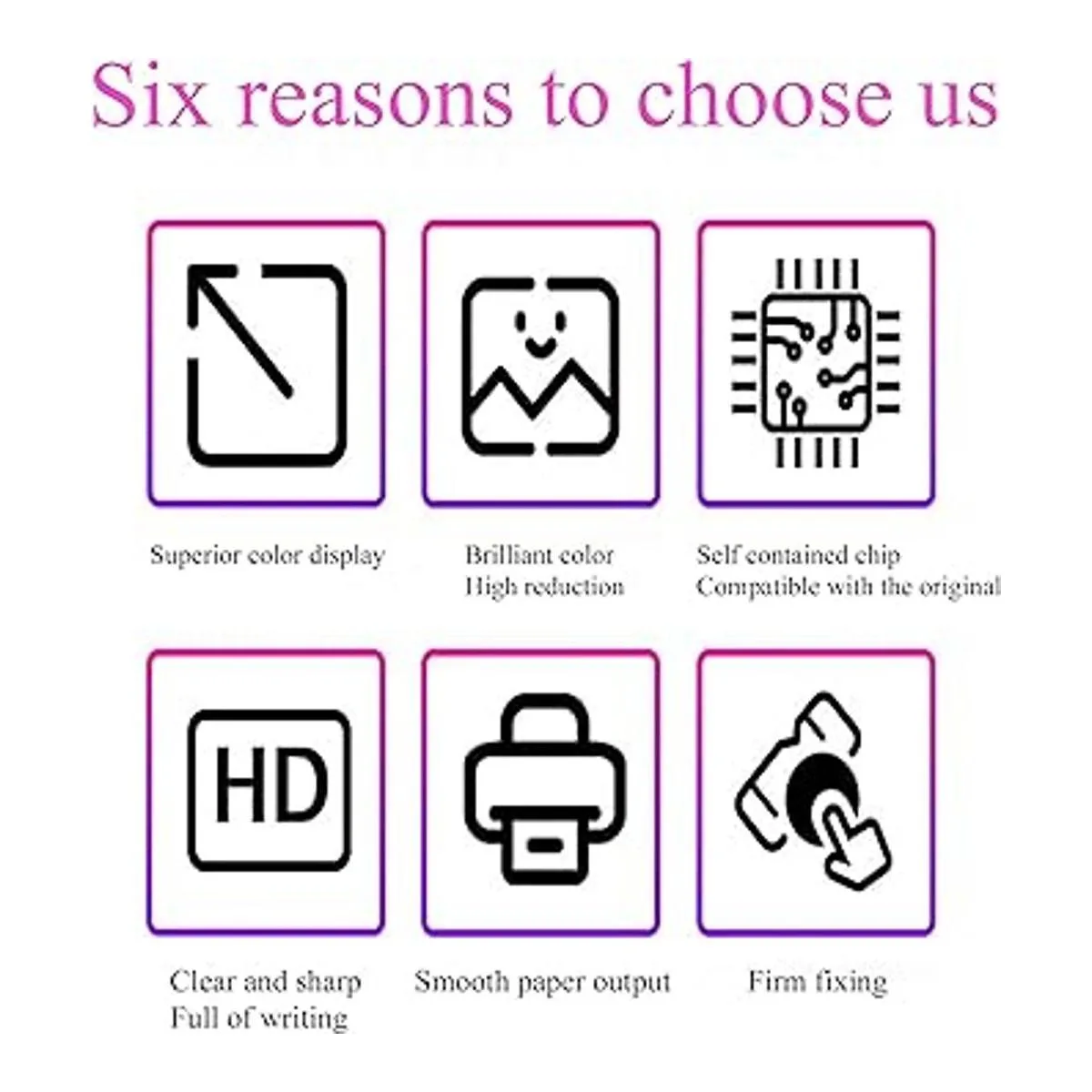Proporciona alta calidad: impresión clara, larga duración sin decoloración, impresión de alta eficiencia, alto rendimiento de páginas, ahorro de dinero. Productos adecuados para escuelas, hospitales, departamentos gubernamentales, empresas, familias, etc.