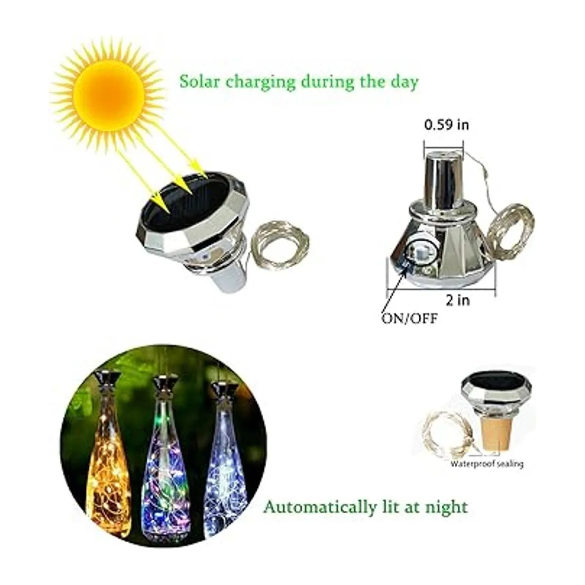 Diseño único de aspecto de diamante: la apariencia de las luces solares para botellas de vino es hecha a mano plateada. La luz solar impermeable de alta calidad parece un diamante real al sol. Parte superior de diamante: 2.0 in de diámetro, 0.6 in en la parte inferior. El puerto de inserción de la botella de diamante está diseñado para adaptarse a todas las botellas ordinarias, por lo que no hay necesidad de preocuparse por encontrar una botella adecuada para las luces de hadas de estas botellas de vino.
