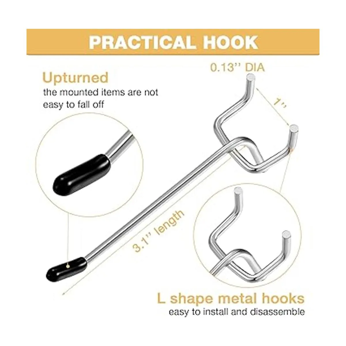 Ofrece una buena experiencia de uso: diseñados con una forma de L, estos ganchos de tablero de clavijas no se caen fácilmente de la tabla, y se pueden fijar después de la instalación; el diseño de punta de goma evita que tus objetos de valor se caigan