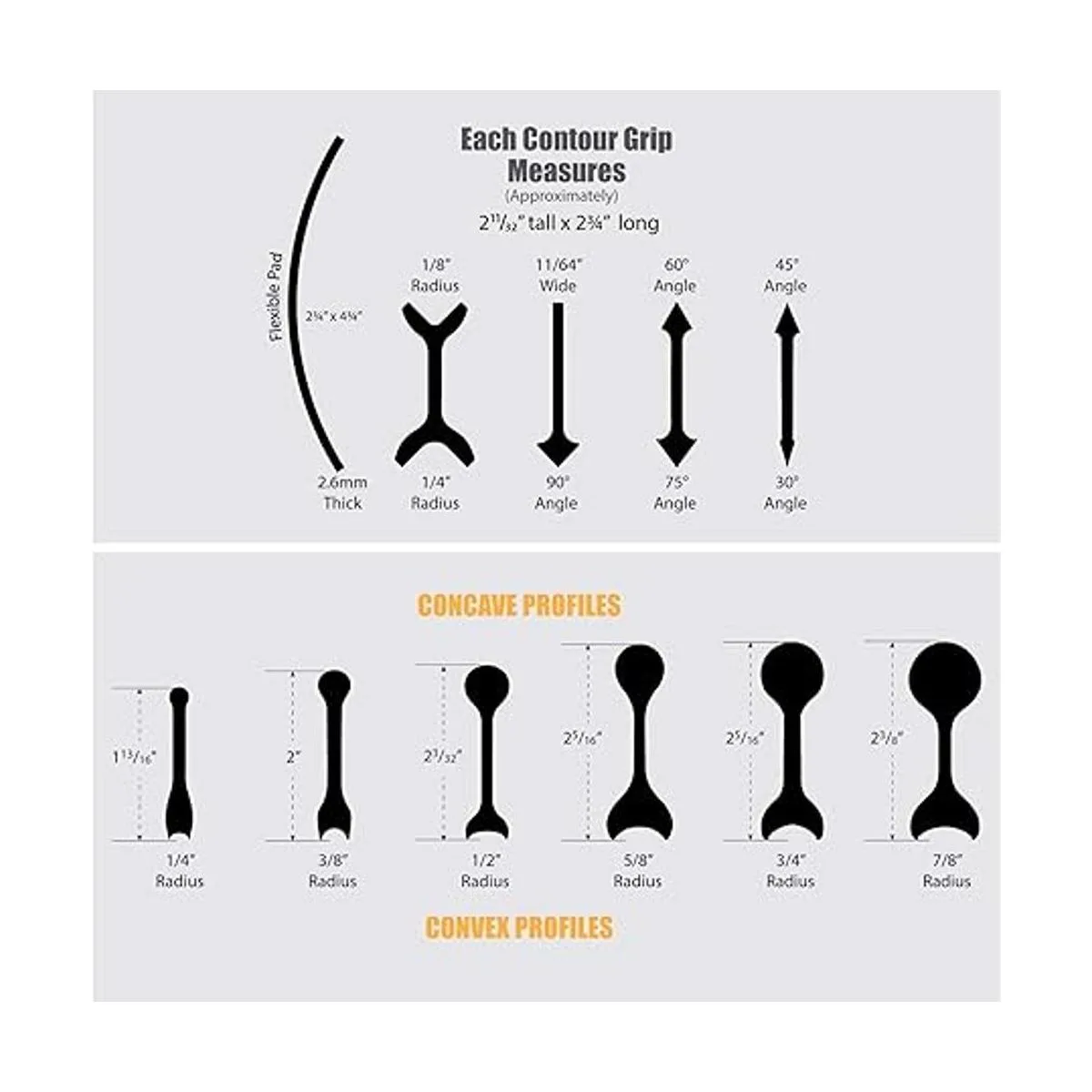 Este juego de 11 piezas viene con lo siguiente: almohadilla flexible de 0.102 in de grosor, agarre redondo de 1/8 pulgadas y pulgadas, agarre de 90 grados, agarre de 60 y 75 grados, agarre de 30 y 45 grados y 1 cada contorno se agarra con los siguientes diámetros interiores/exteriores: 1/4 pulgadas, 3/8 pulgadas, 5/8 pulgadas y 7/8 pulgadas.