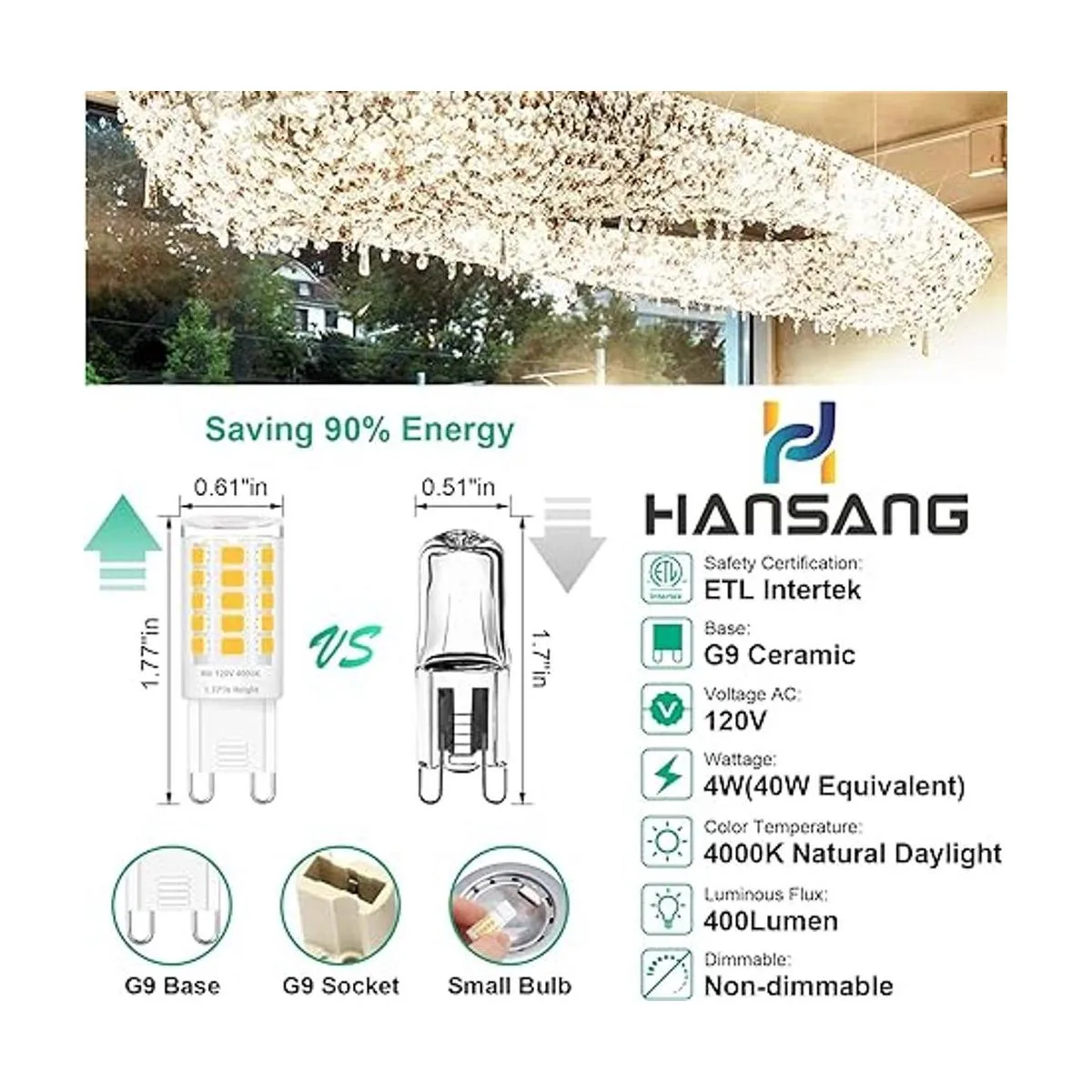 Paquete de 12 bombillas LED G9 de 4000 K de luz diurna natural, altura de 1.77 pulgadas, 4 W equivalente a halógeno de 40 W, bombillas cortas Hansang T4 para candelabro de cristal, base de pasador de cerámica G9, 400 LM, CA 120 V, no regulables