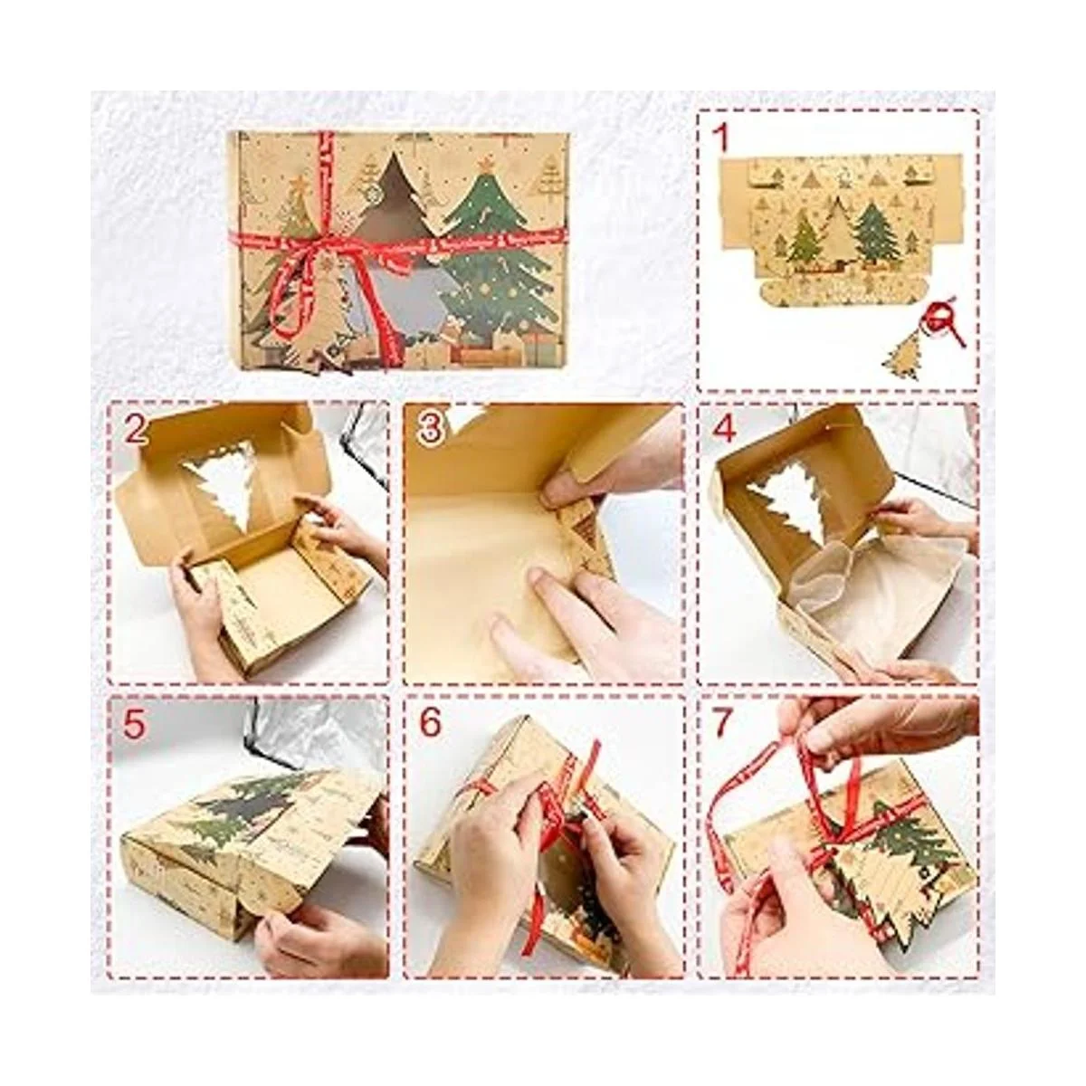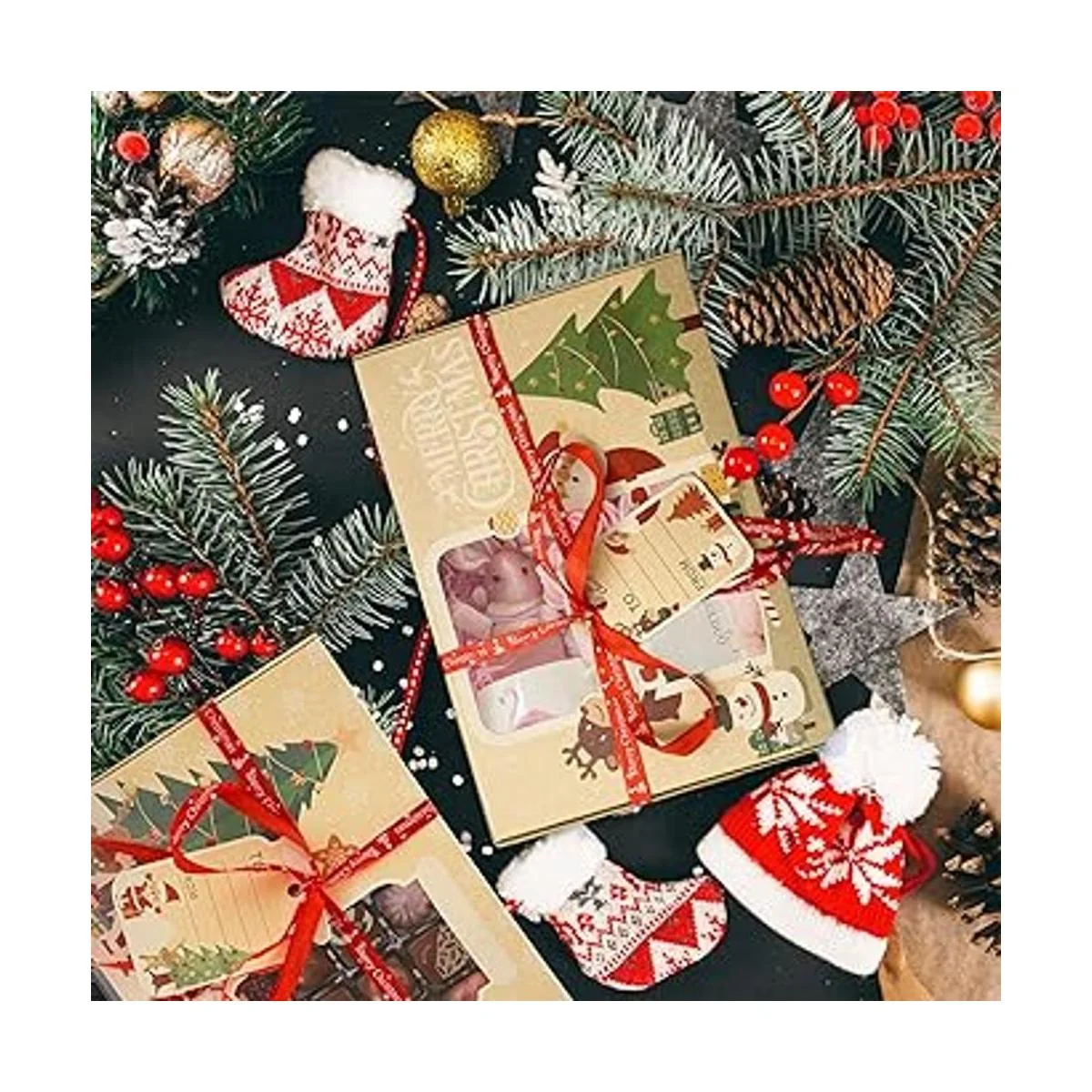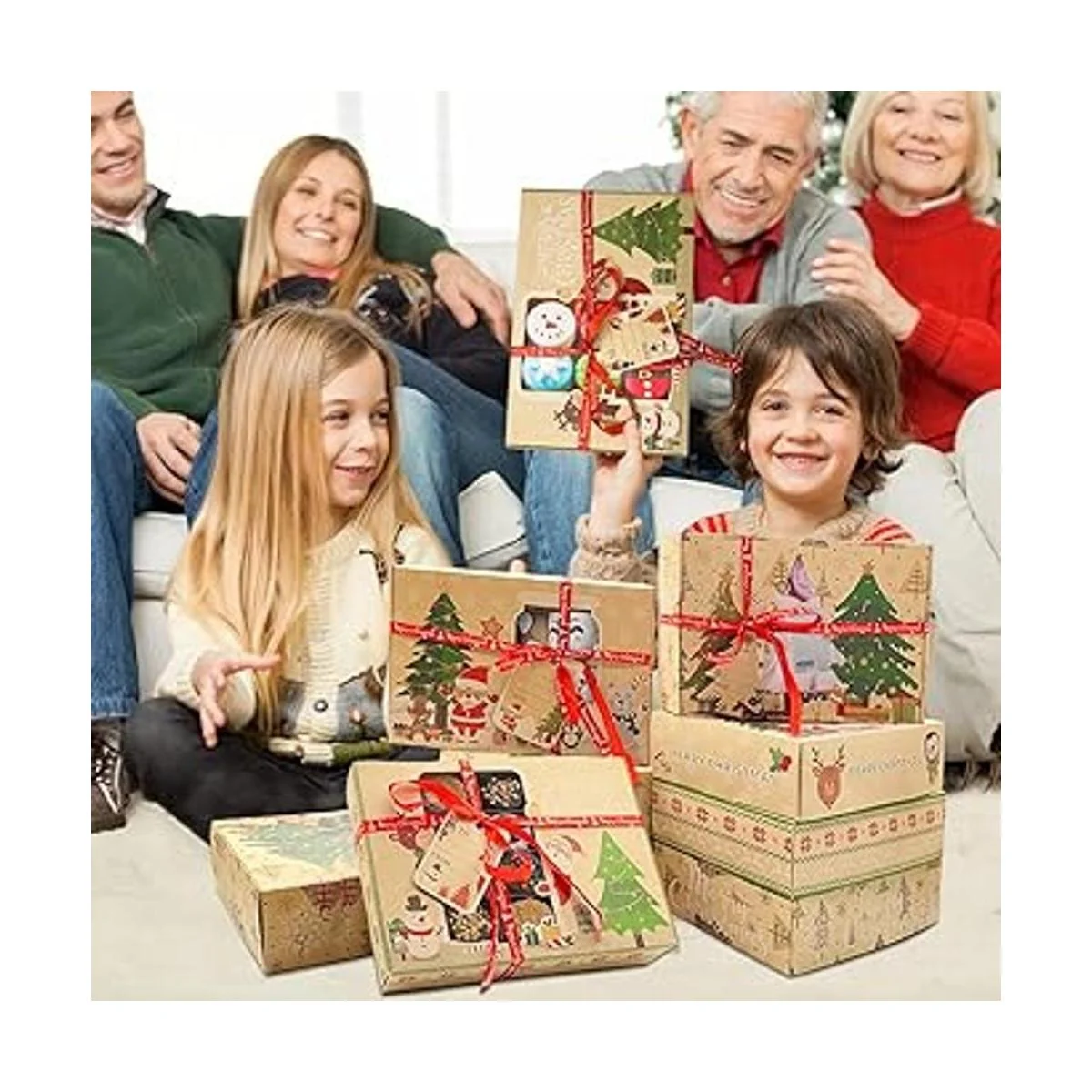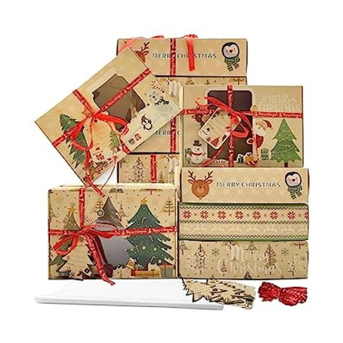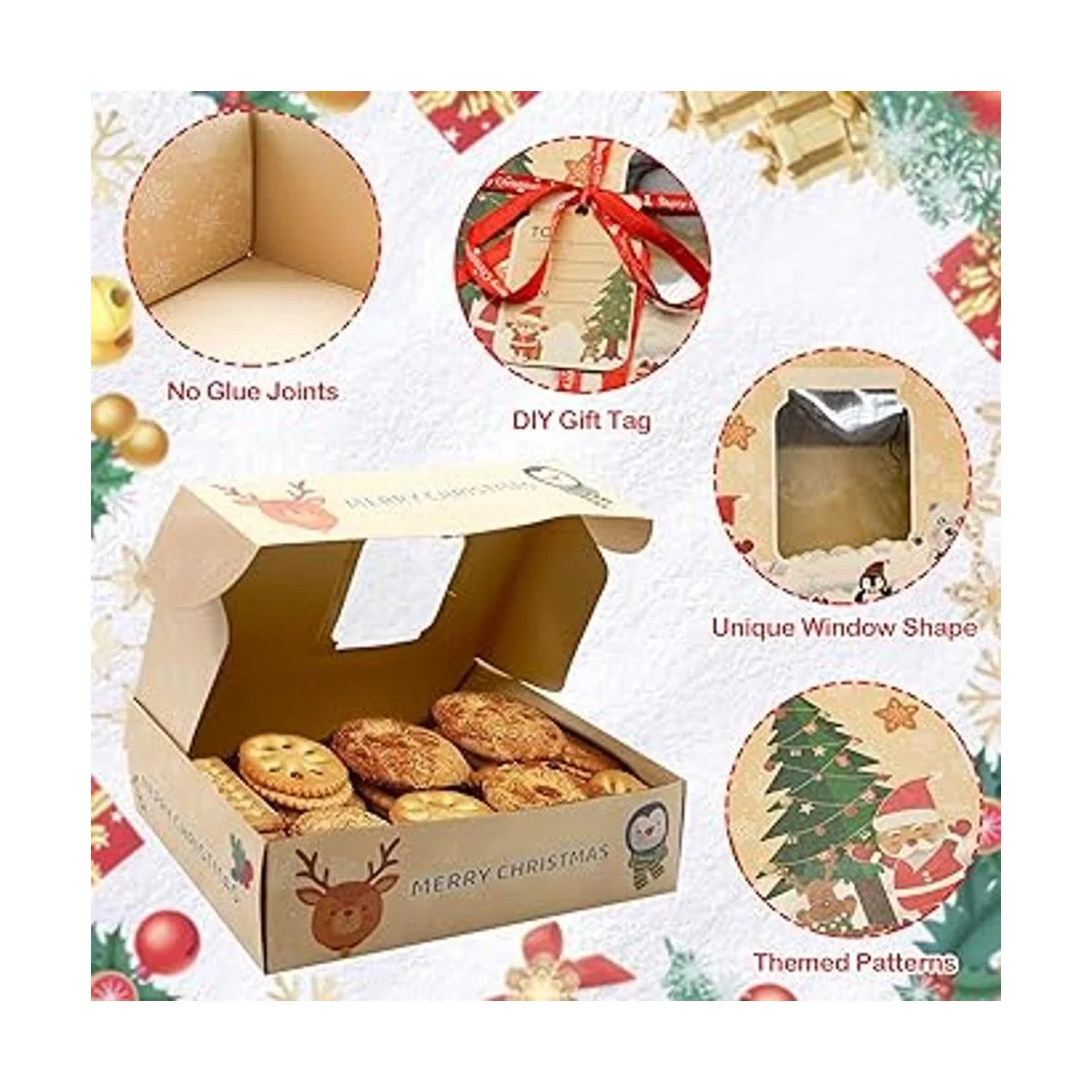 Paquete de 12 cajas de galletas de Navidad marrones con ventana para regalo, árbol de Navidad de dibujos animados, muñeco de nieve, pingino, fondo de vacaciones, cajas de regalo de panadería, cajas de regalo de papel kraft de Navidad con cintas y etiquetas de regalo de bricolaje, pastelería, dulces, recuerdos de fiesta