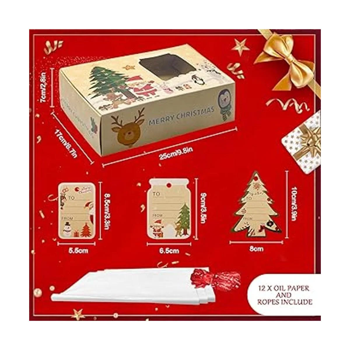 Caja de regalo para galletas de estilo navideño: viene con 12 paquetes de cajas de regalo en 3 diseños diferentes, 12 etiquetas de regalo colgantes, 12 papeles de aceite, 12 cuerdas rojas y blancas, cantidad abundante que las hace una buena opción de embalaje para Navidad; 8.6 x 5.9 x 2.75 pulgadas largo x ancho x alto, gran capacidad de almacenamiento, junto con una etiqueta de regalo cuidadosa, que es una bonita caja de regalo para Navidad