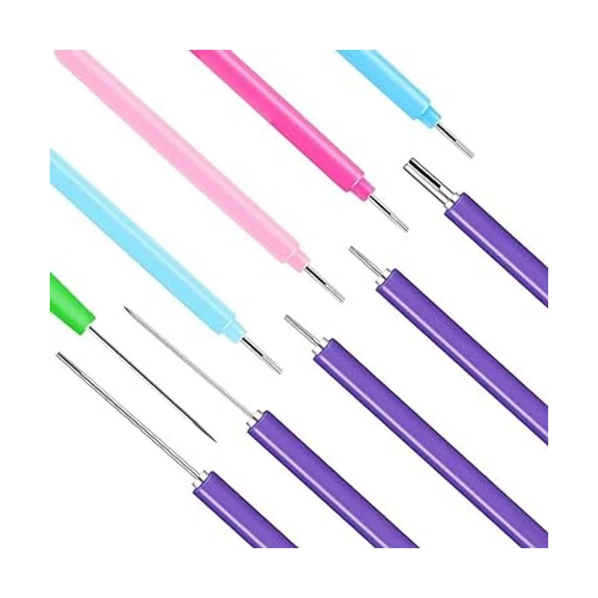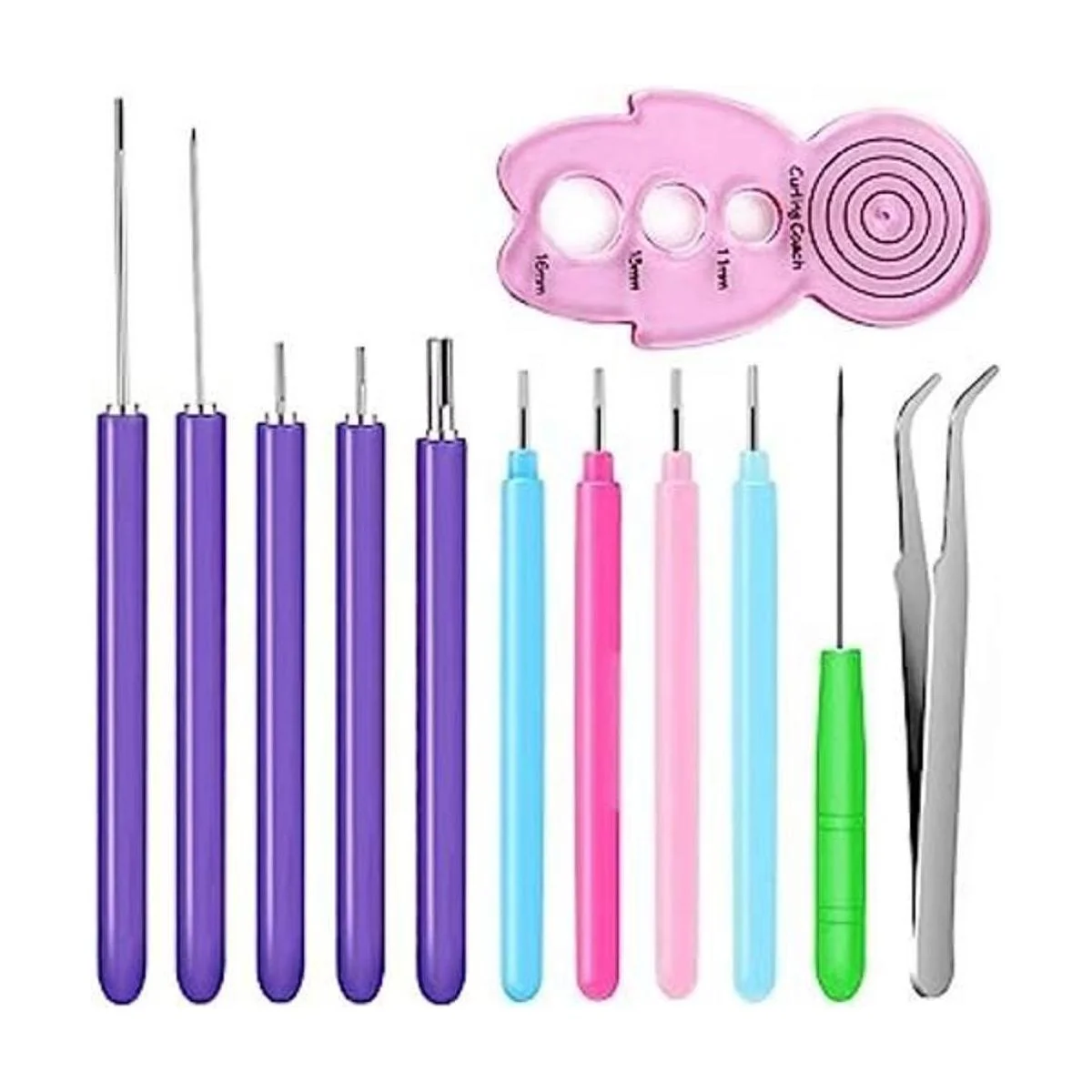 El paquete incluye: recibirás 1 entrenador de rizado, 4 bolígrafos de aguja coloridos rosa, azul claro, azul, y el color de la herramienta de aguja es aleatorio, una pinza y 5 bolígrafos de aguja ranurados morados.