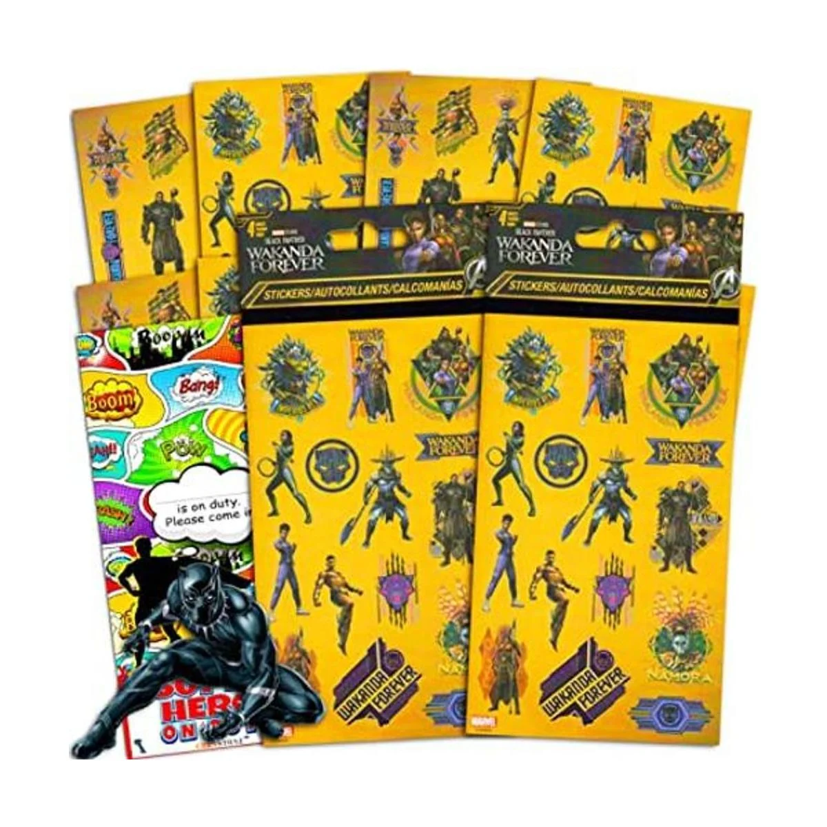 Más de 120 pegatinas de Black Panther con personajes favoritos de la película Black Panther y los Vengadores. Incluye colgador de puerta de superhéroe con licencia por separado.