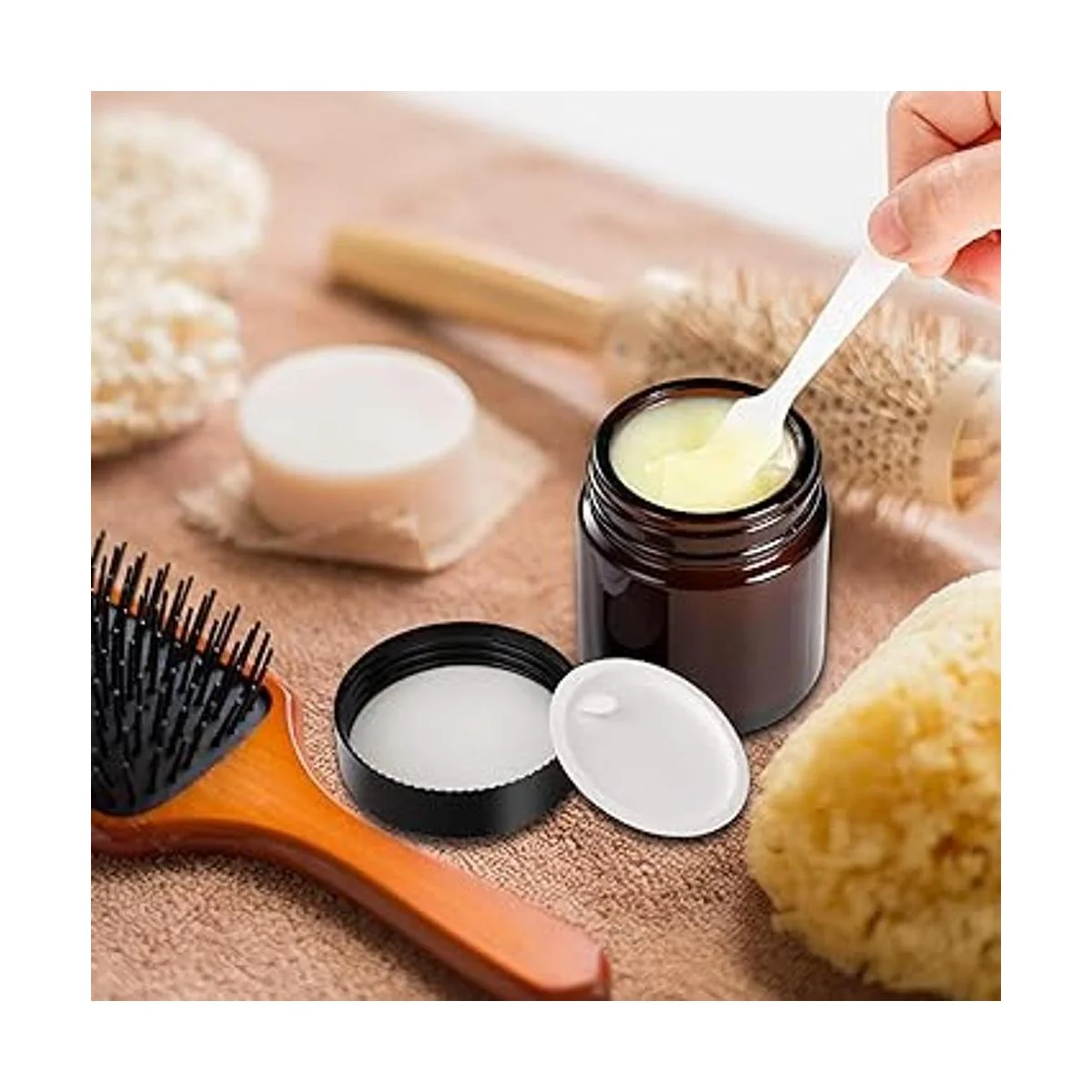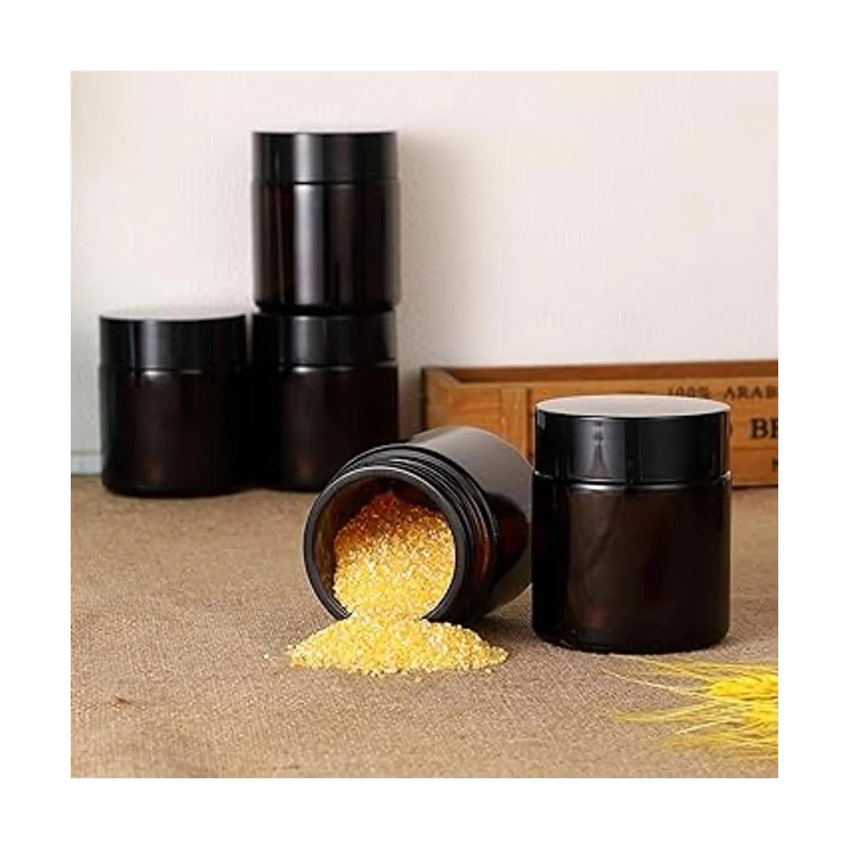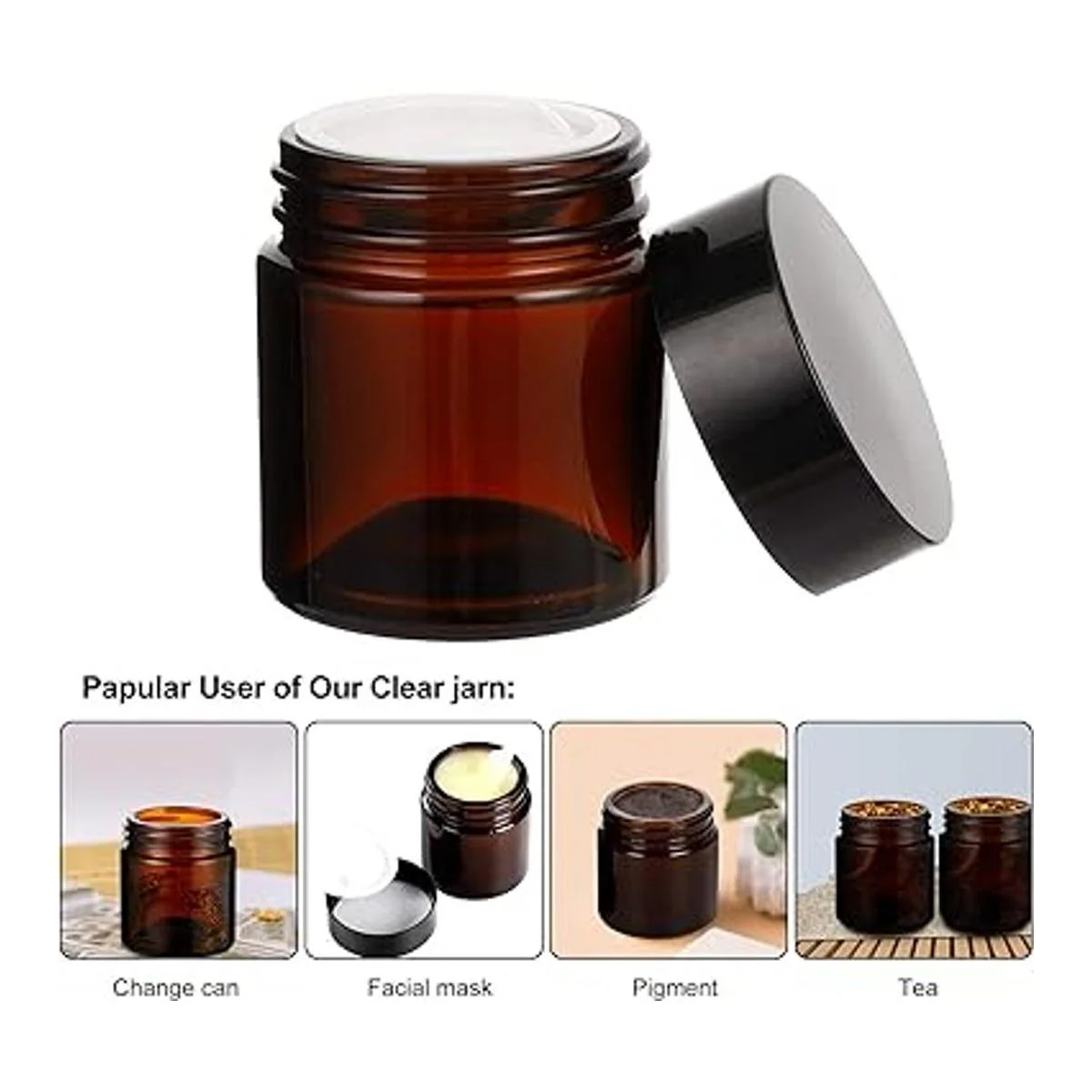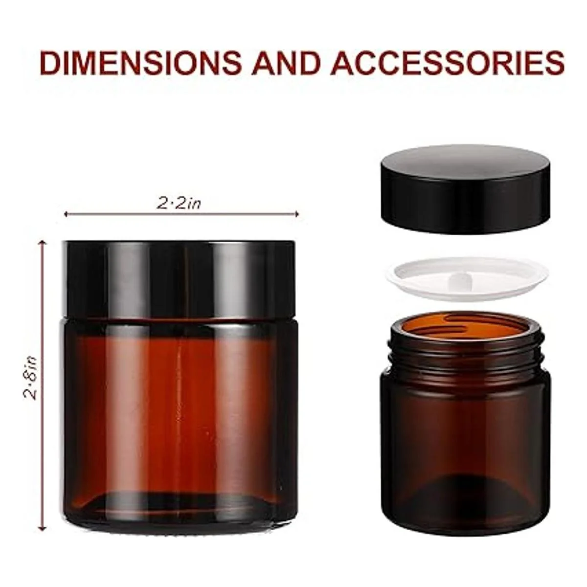 Paquete de 15 tarros de cristal ámbar con tapas, recipientes redondos vacíos para exfoliantes, lociones, cosméticos, ungentos y mantequillas, tarro de almacenamiento de viaje con forros interiores blancos, tapas negras, etiquetas y espátulas