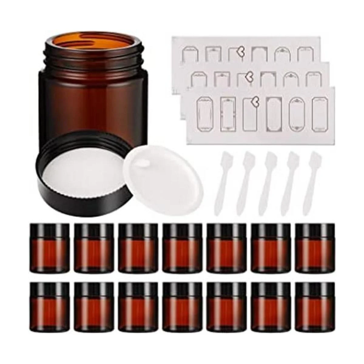 1. Incluye 15 tarros de cristal ámbar de 4.0 fl oz con forro interior y tapas de cúpula, 5 espátulas cosméticas y 18 etiquetas.