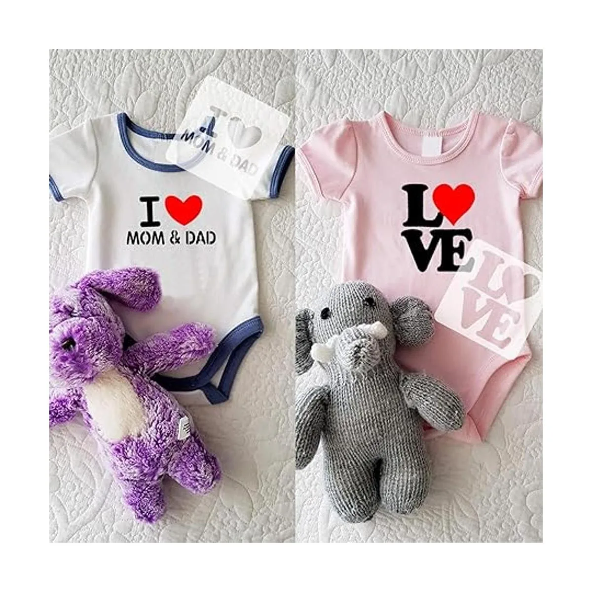 Plantillas temáticas de baby shower: tamaño grande perfecto de aproximadamente 5.1 pulgadas de largo y 5.1 pulgadas de ancho, diseñado específicamente para productos para bebés como camisetas, mamelucos, baberos, pañales de tela, etc. Cada plantilla incluye un patrón grande, diferente con otros patrones pequeños. Fácil de usar y limpiar.