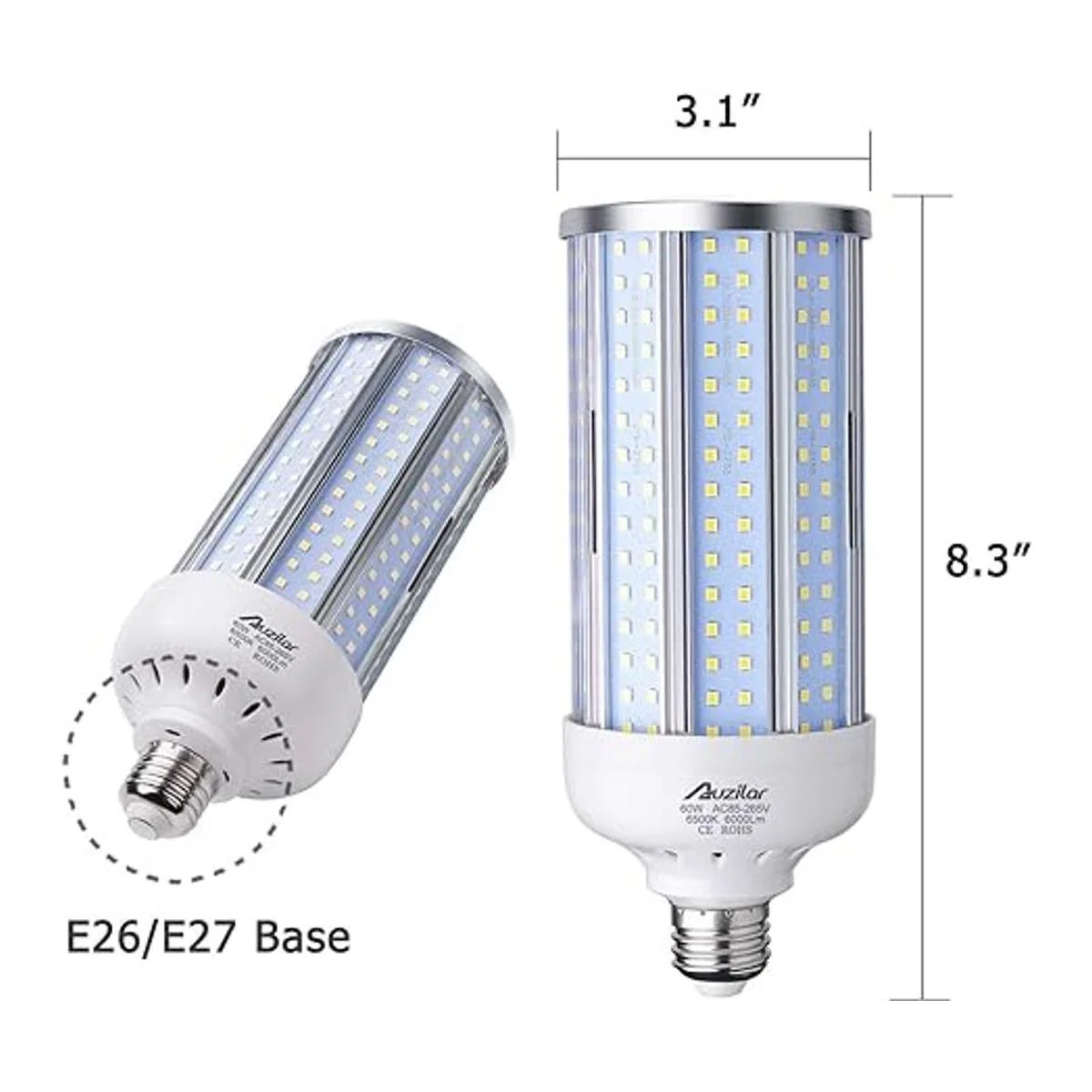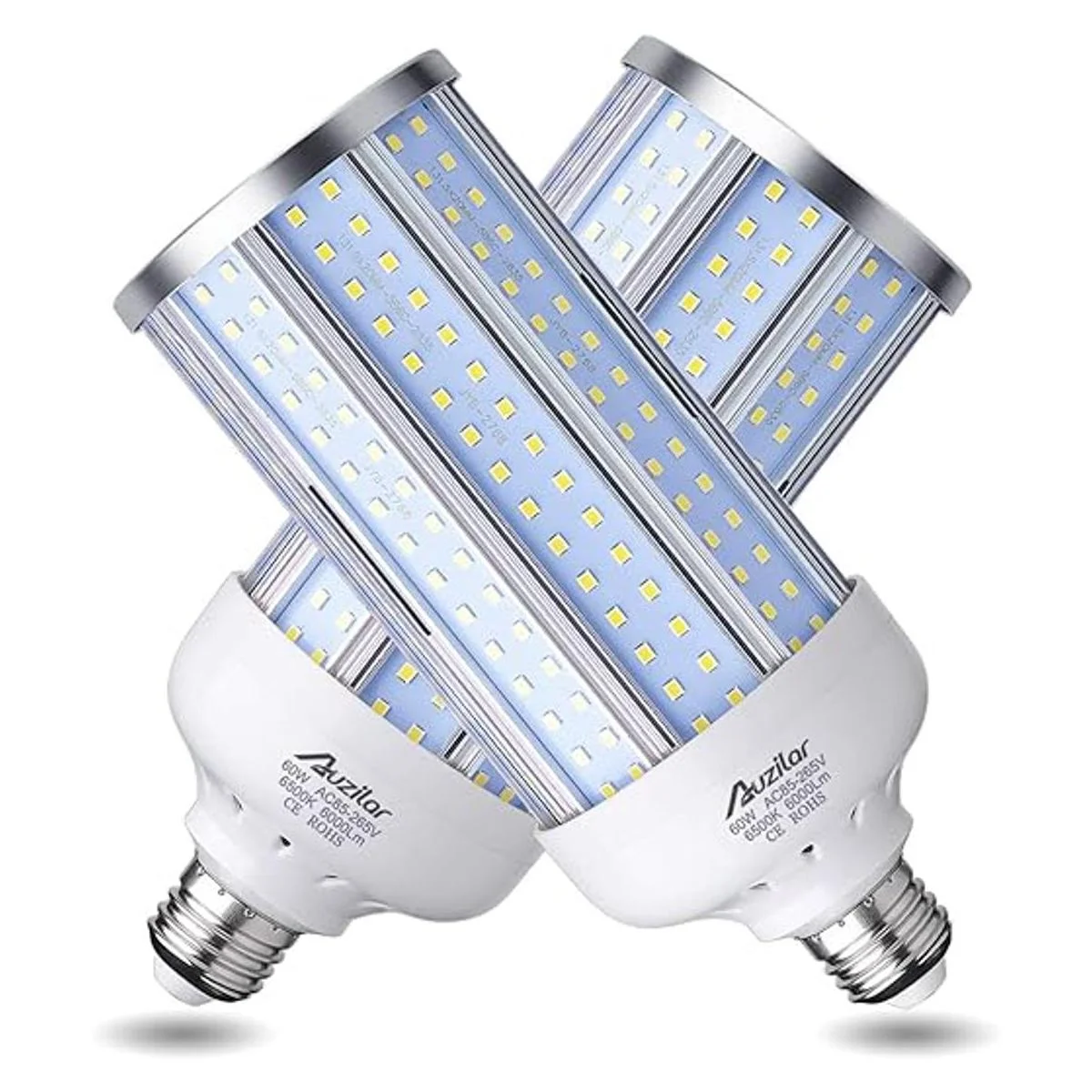 Paquete de 2 bombillas LED equivalente a 500 W de 60 W, 6000 lúmenes, 6500 K, luz de día blanca fría E26E27, base media para interior garaje, almacén, fábrica, taller, calle, patio trasero AC 85 V265 V