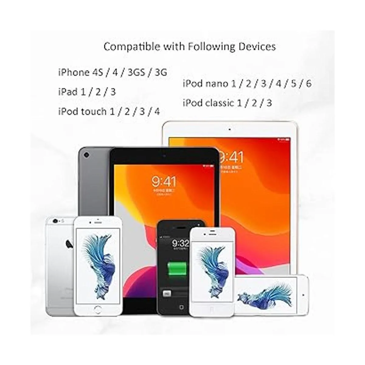 Compatible con iPhone 4S / iPhone 4 / iPhone 3GS / iPhone 3G; iPad: 1 / 2 / 3 generación; iPod Touch: 1 / 2 / 3 / 4 generación; iPod nano: 1 / 2 / 3 / 4 / 5 generación; iPod clásico: 1 / 2 generación