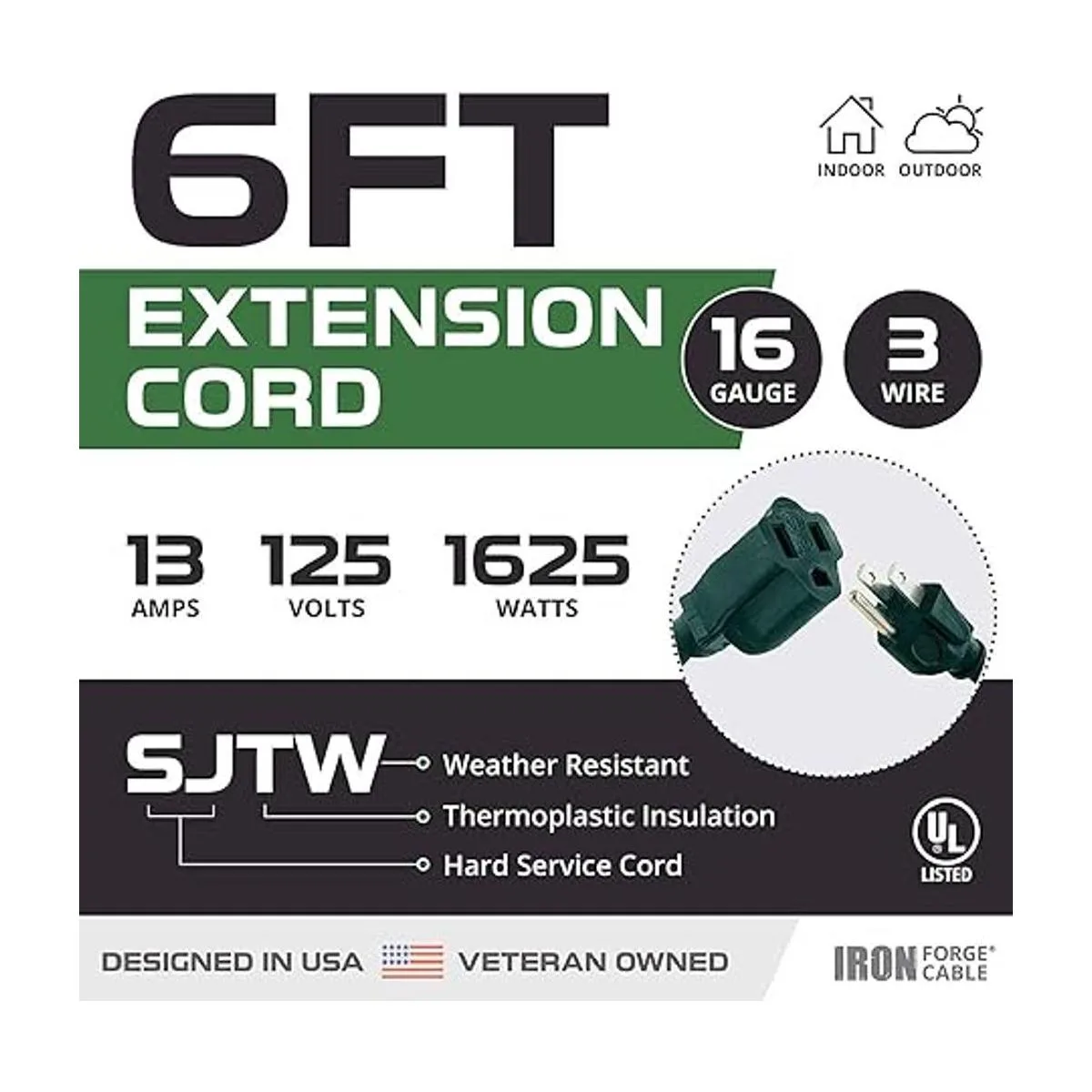 Listado UL. 3 cables de extensión de cables, 6 pies, 13 amperios, 125 voltios, 1625 vatios. Rango de temperatura: 40 F a 140 F