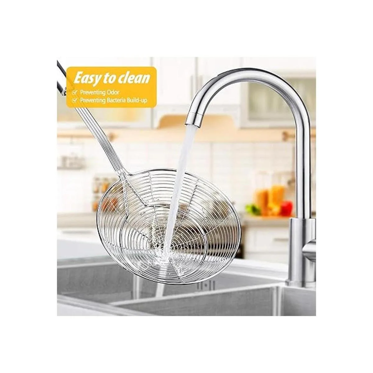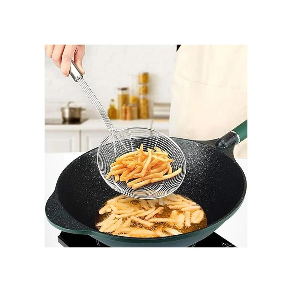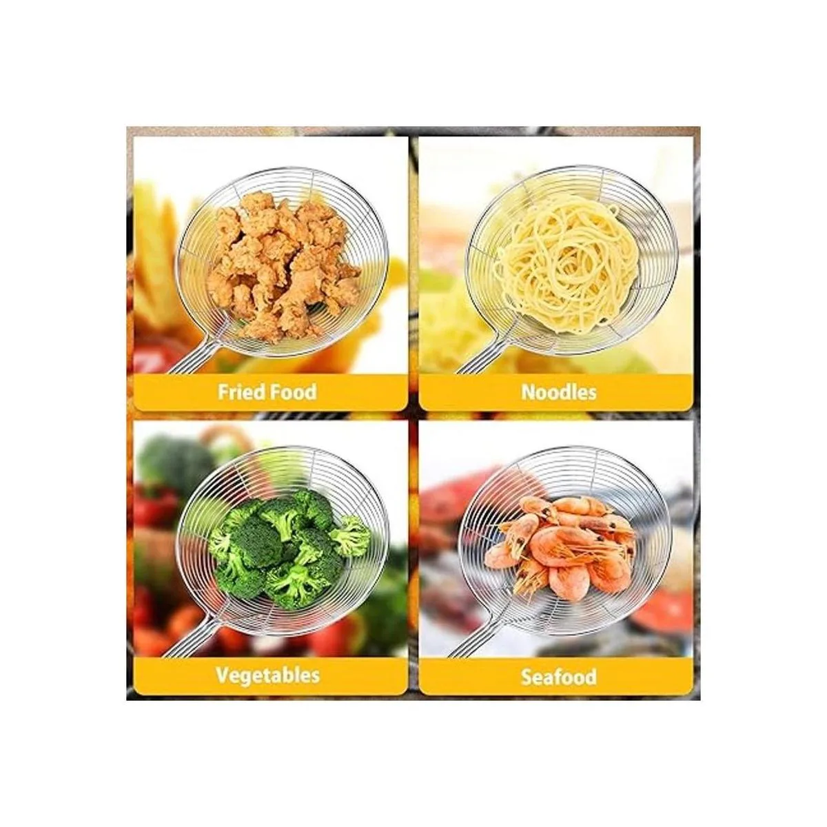 Práctico y fiable ayudante de cocina. Cocina tus alimentos favoritos más rápido con este colador de calidad premium. Nuestros coladores de alimentos están diseñados con una amplia cesta para recoger y levantar alimentos mientras drenas aceite caliente o líquidos hirviendo. La comida se coloca en el filtro de alambre para evitar salpicaduras y suciedad. Mantiene tu comida sabrosa y crujiente.