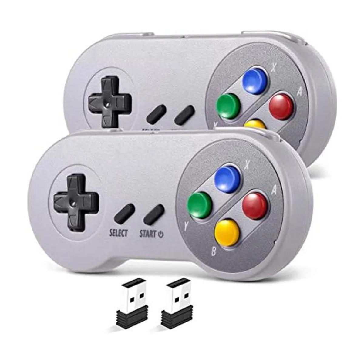 Paquete de 2 controladores USB inalámbricos de 2.4 GHz compatibles con juegos SNES, SAFFUN SNES Retro USB PC Super Classic Controller para Windows PC, MAC Linux Genesis Raspberry Pi Retropie teclas multicolores